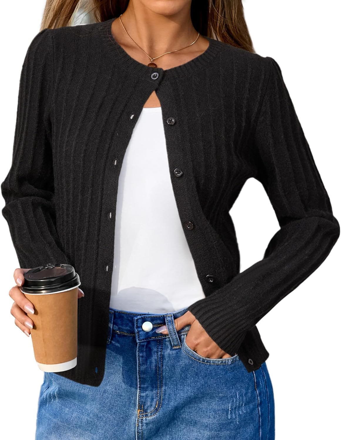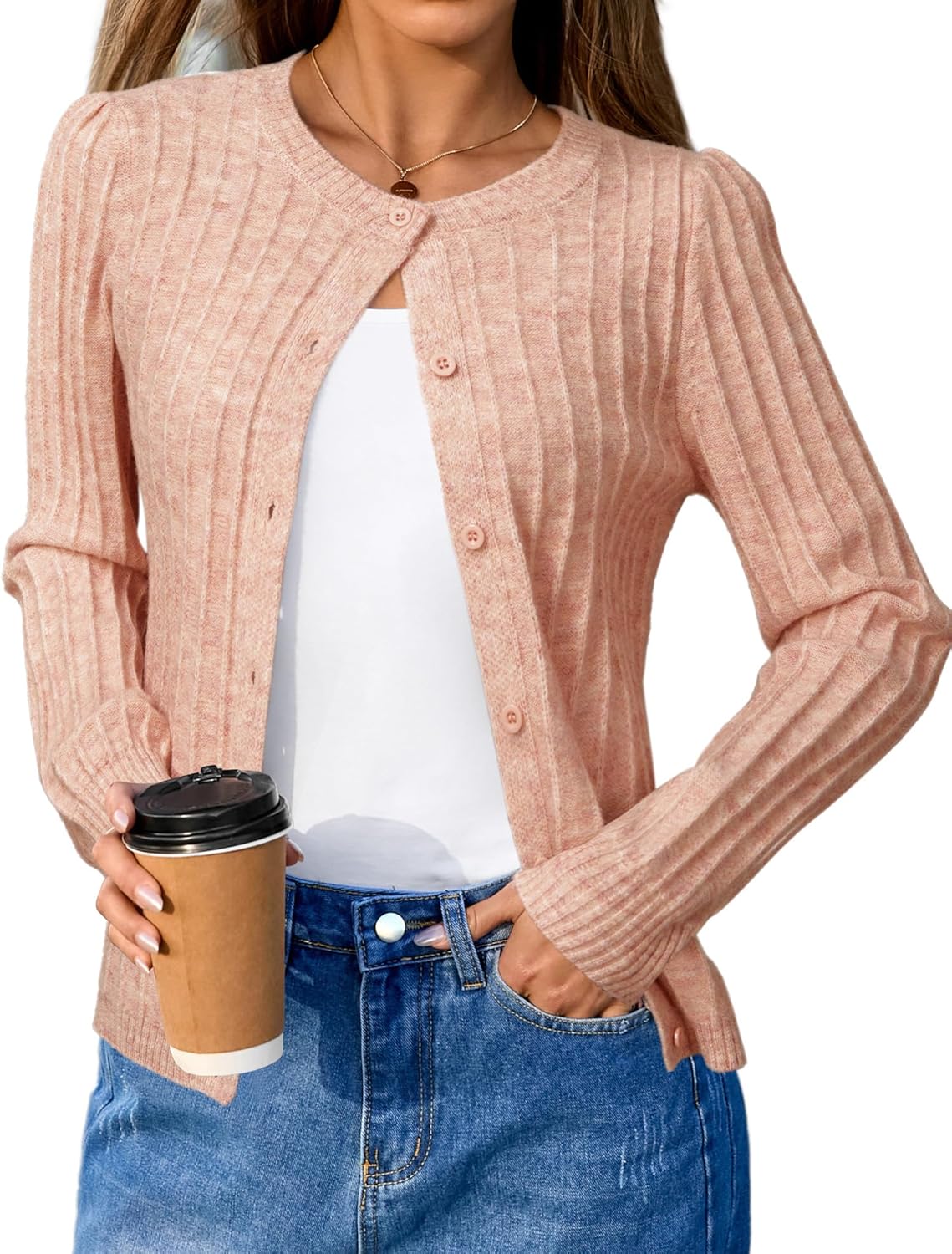 Arach&Cloz 2025 Fall Wool Blend Puff Sleeve Cardigan Sweaters For Women