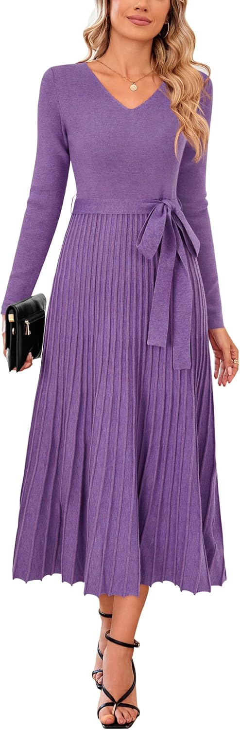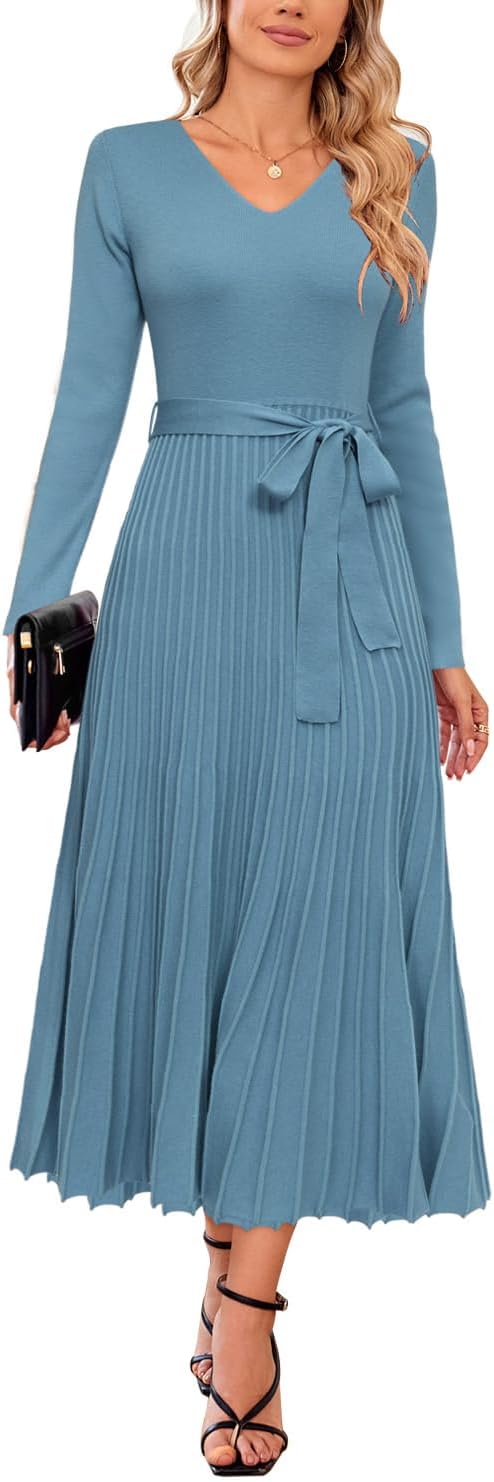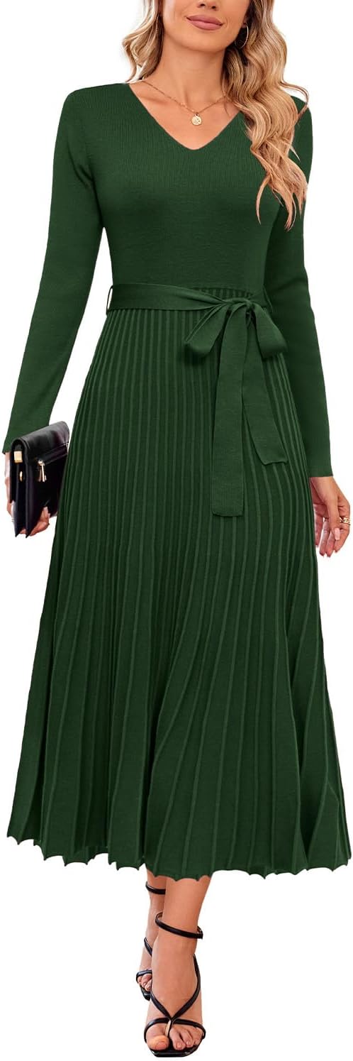Arach&Cloz 2025 Winter Long Sleeve V Neck Tie Waist Pleated A Line Sweater Dress