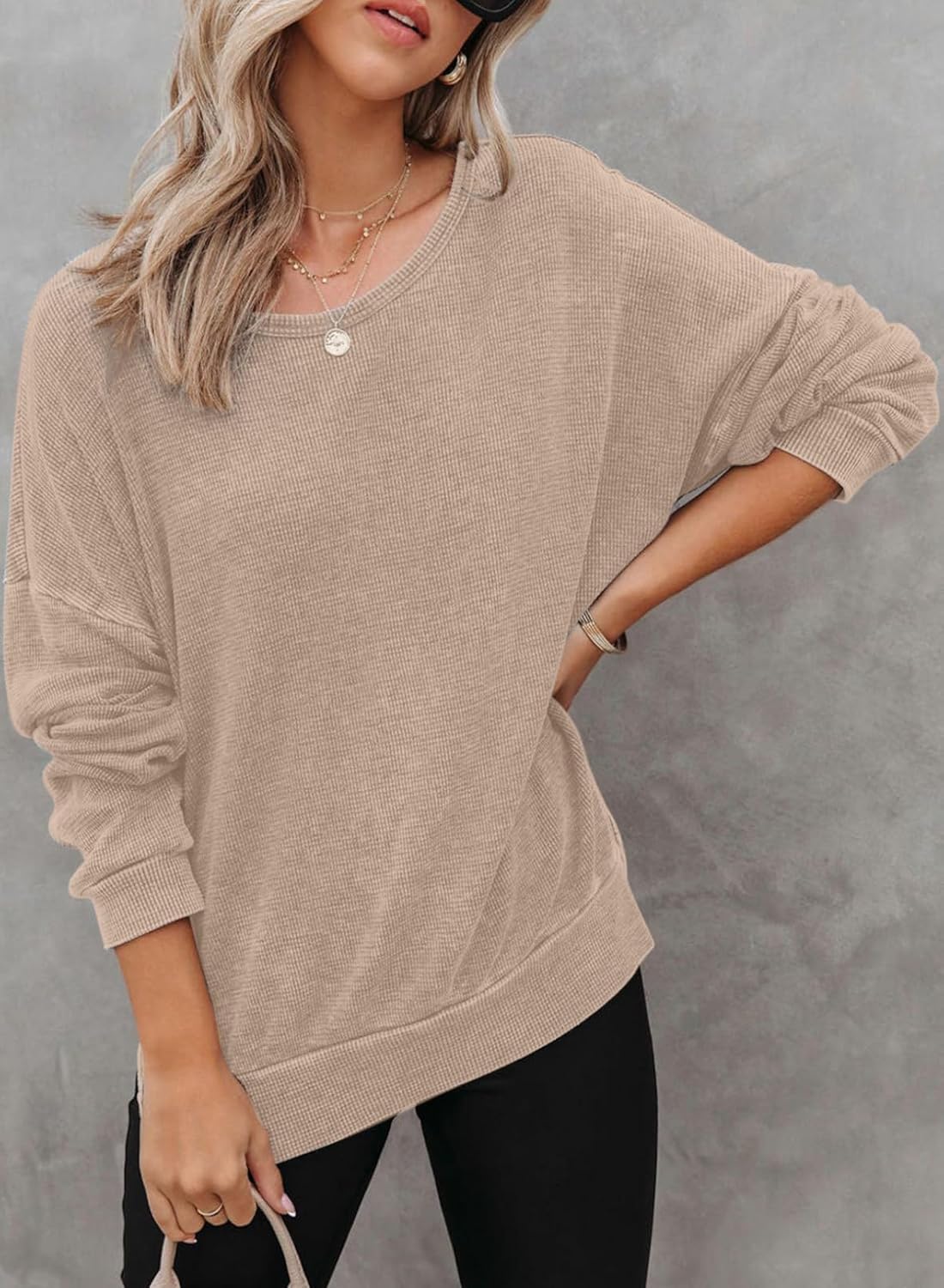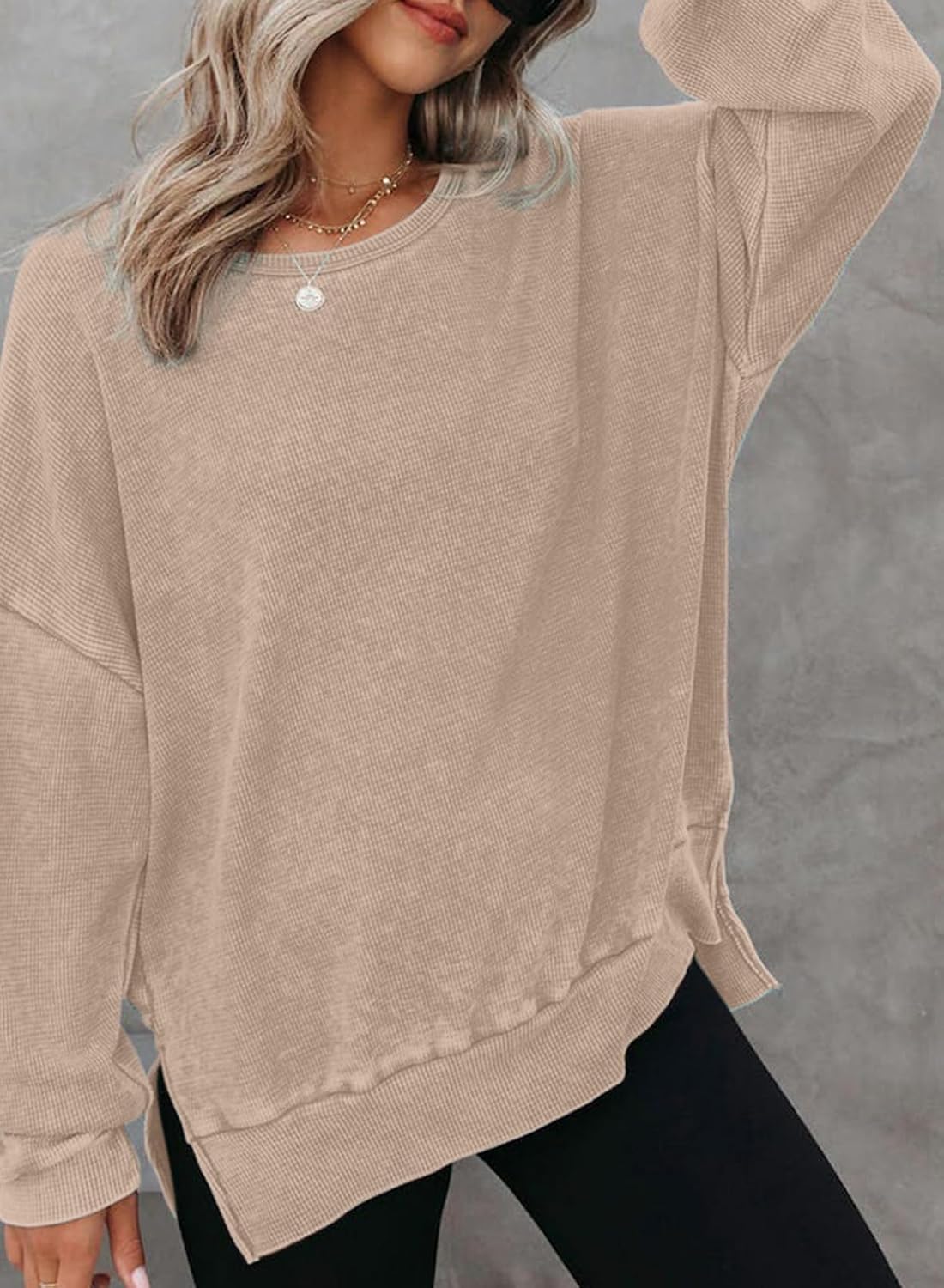 Upgrade your casual style with our Oversized Waffle Knit Crewneck Sweatshirt. Crafted from cozy fabric, this long sleeve pullover features side slits for added flair. Stay effortlessly trendy in our casual sweatshirt fall fashion tops 2025.