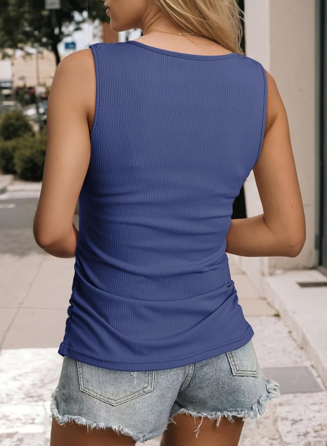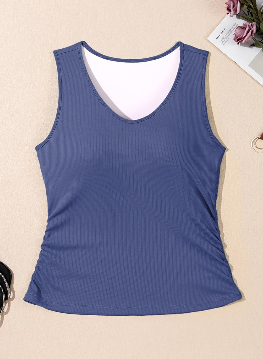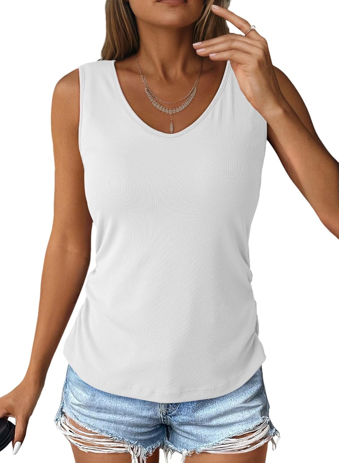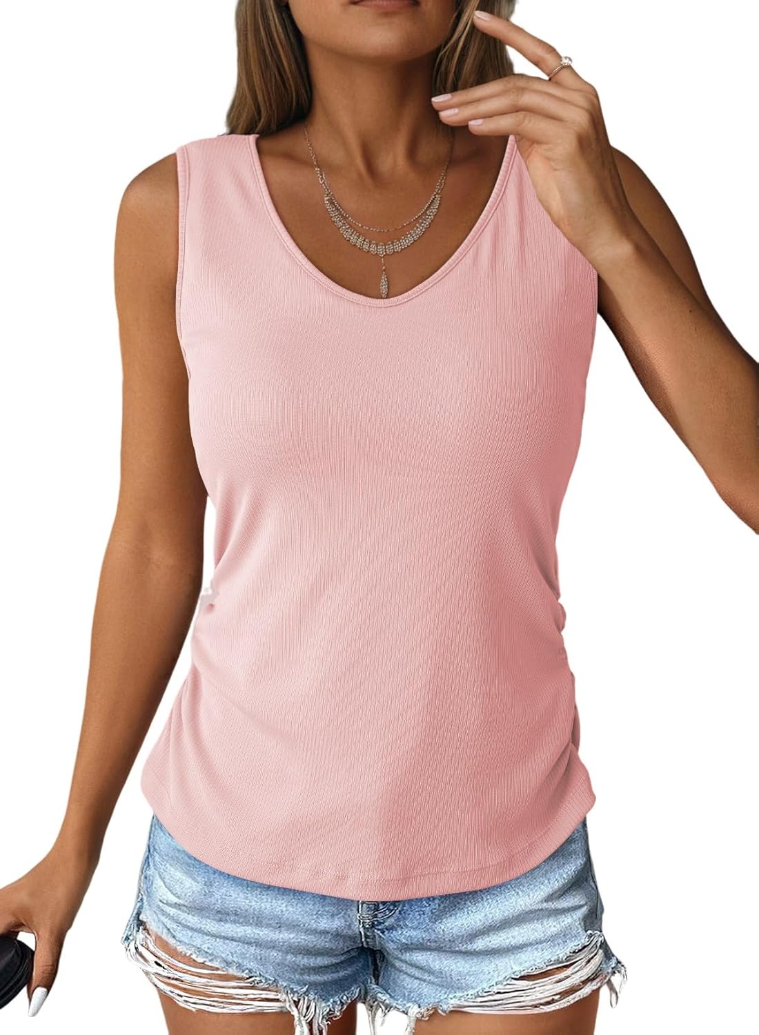 • Dokotoo Tank Top with Built in Bra for Women Casual Summer Sleeveless Tops Slim Fitted V Neck Ruched Cami Shirts