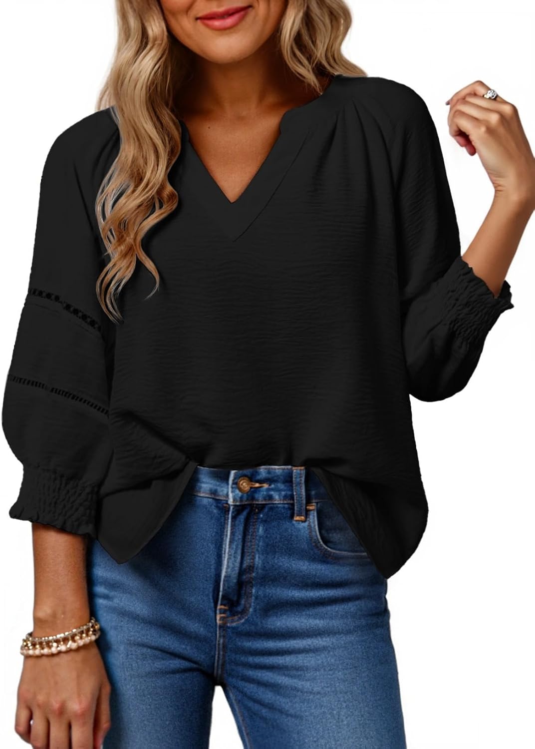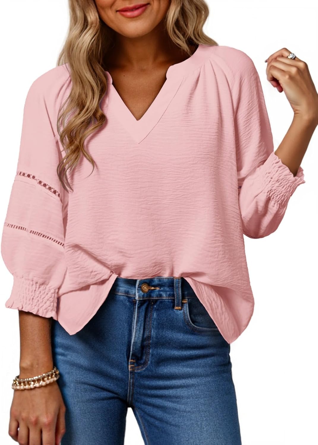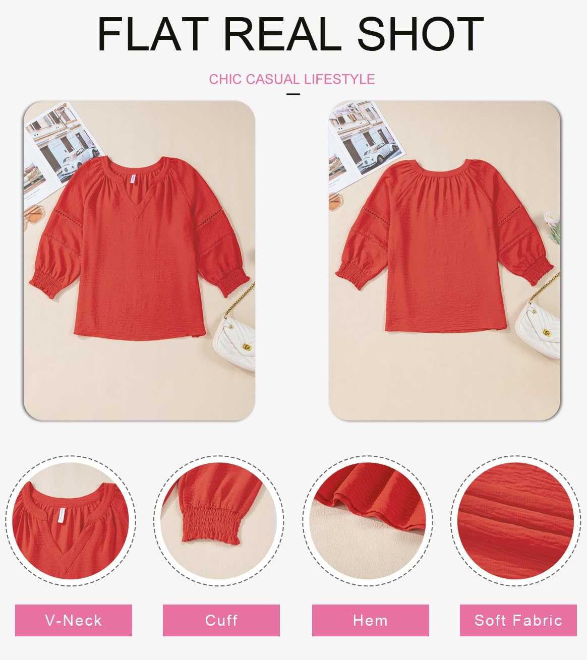 Dokotoo 3/4 Lantern Sleeve Casual V-Neck Pleated Loose Tunic Hollow-Out Blouse