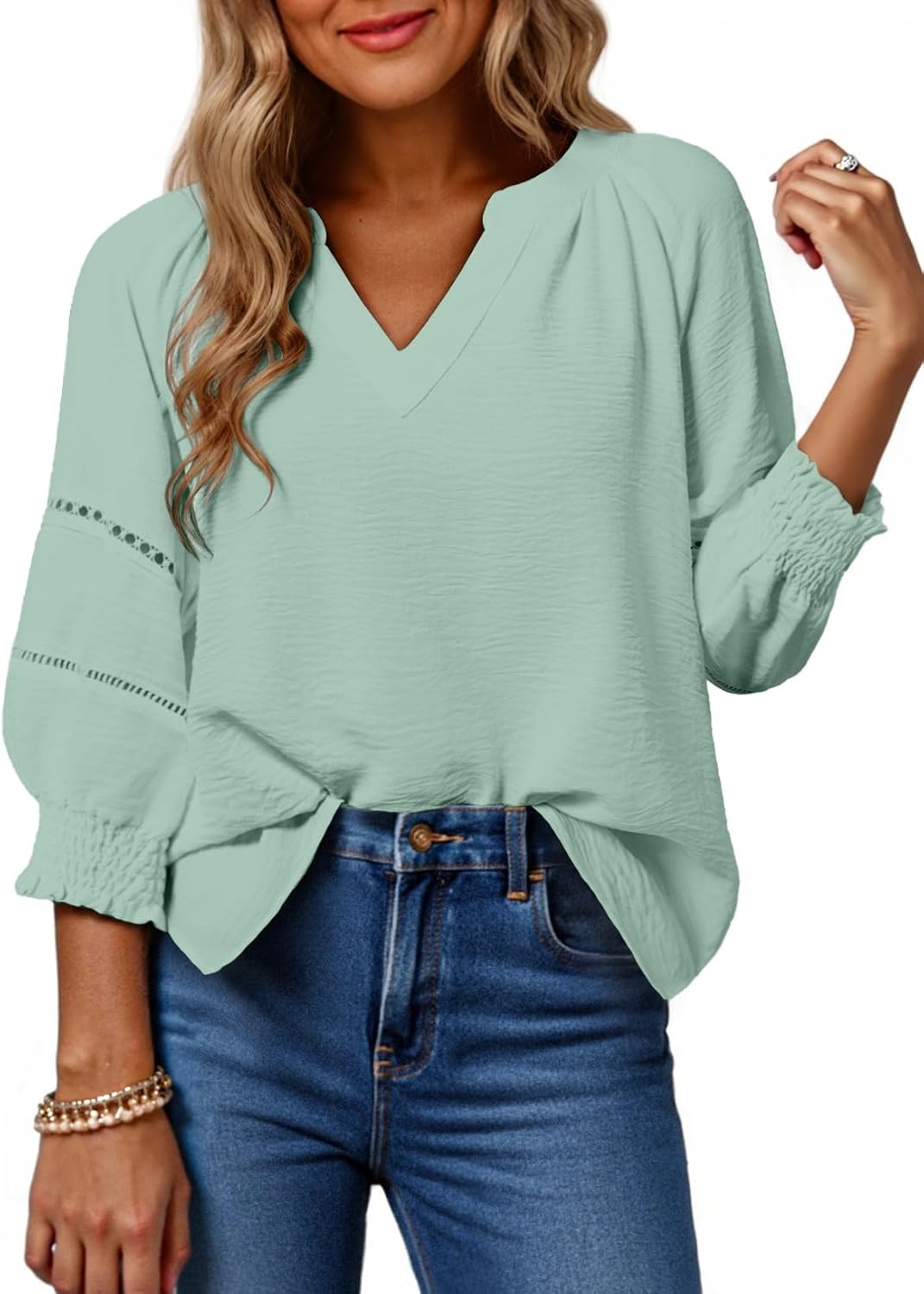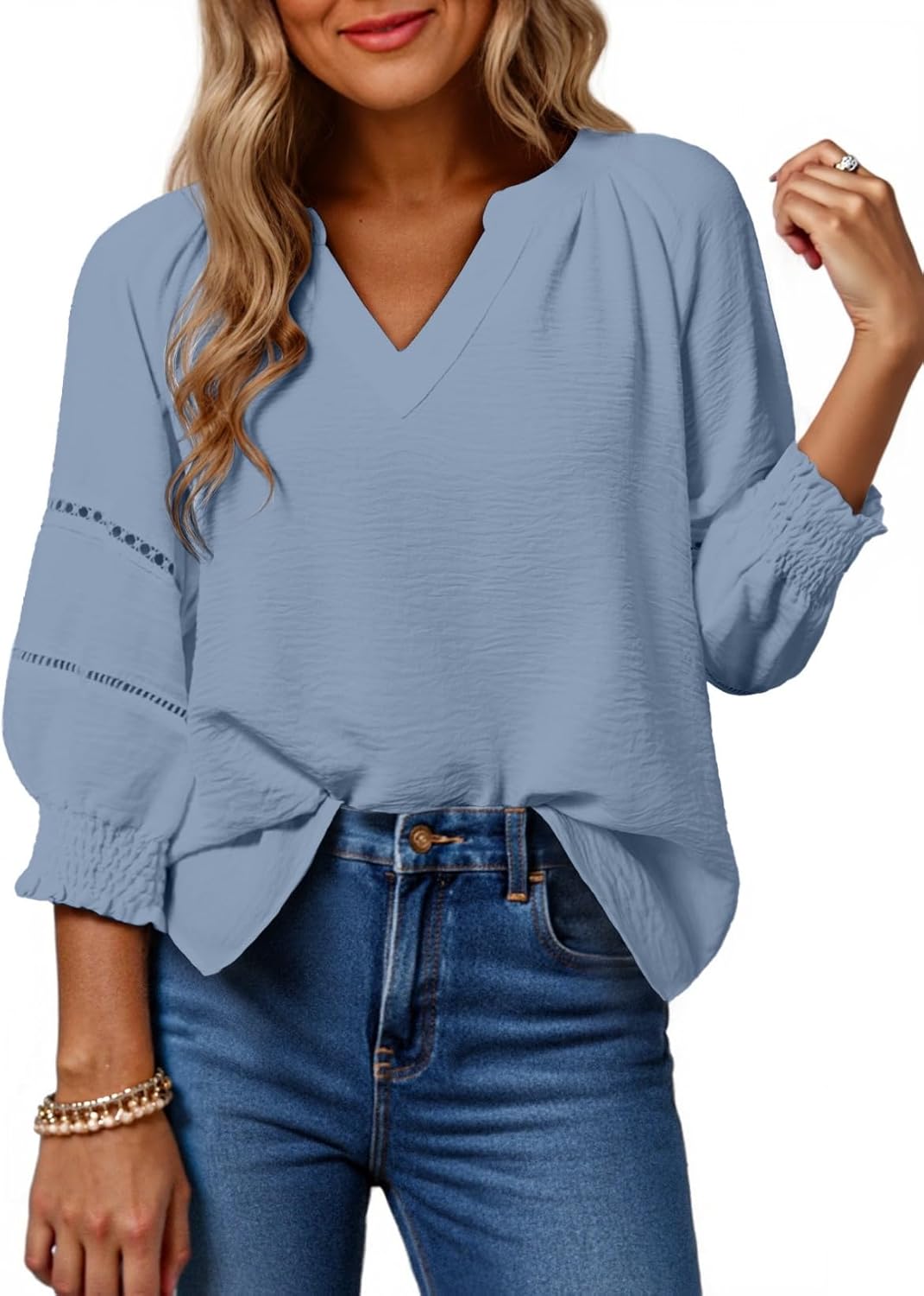 • Dokotoo Womens 3/4 Sleeve Tops Pleated Business Casual Outifits V Neck Blouses Office Loose Shirts