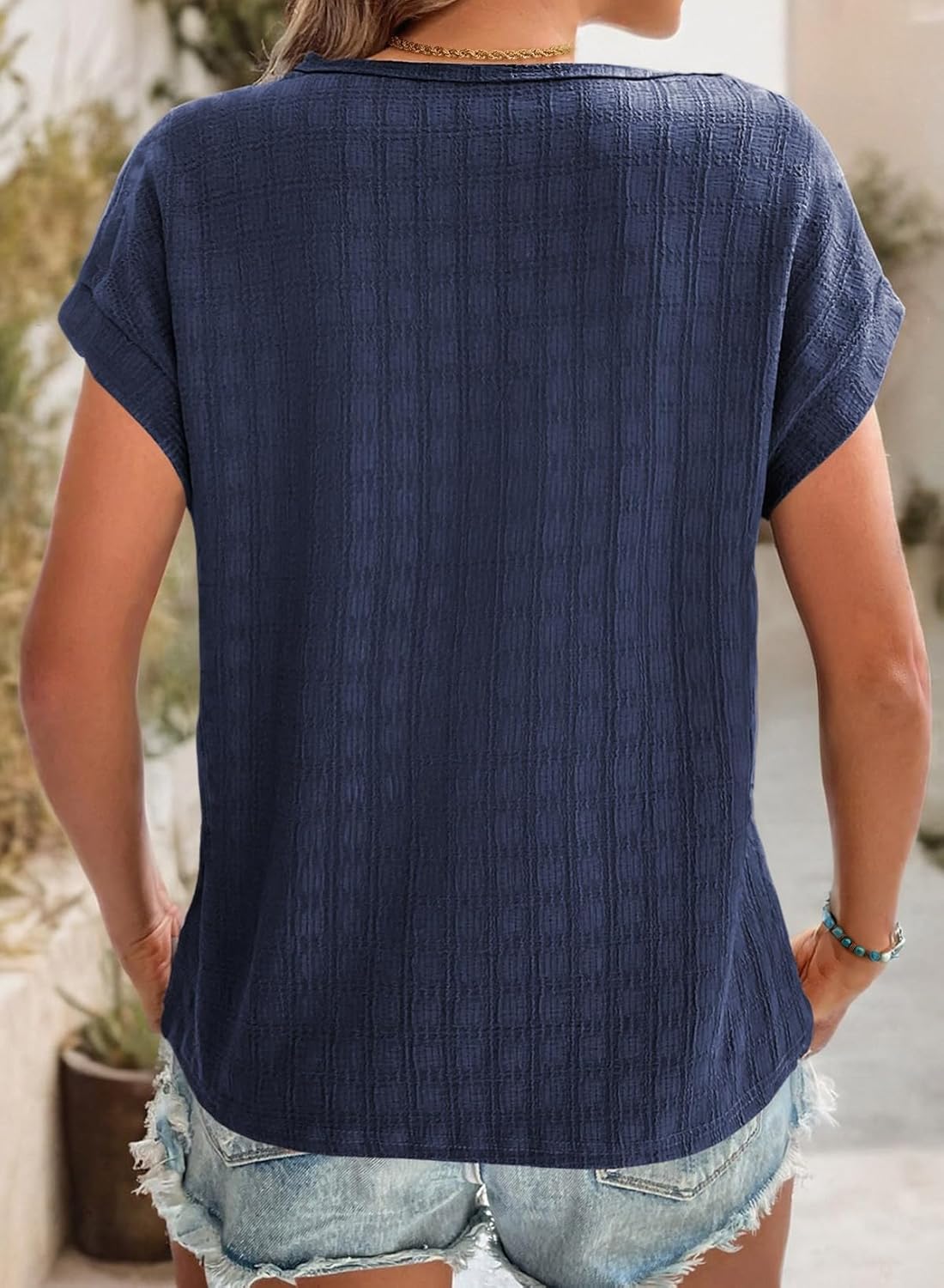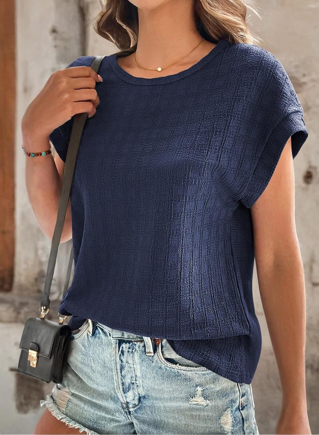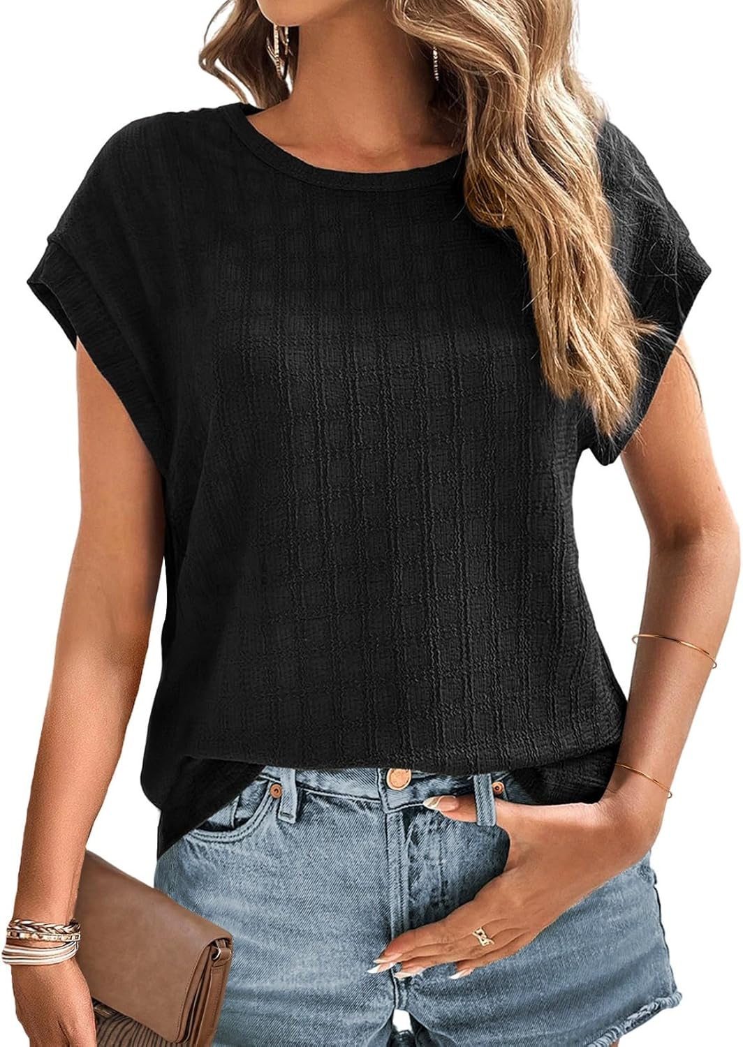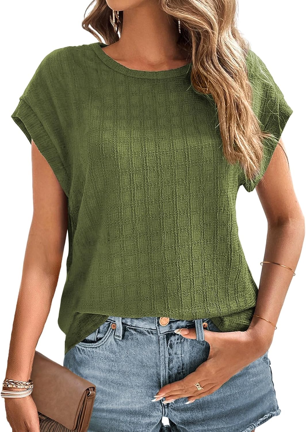 • Dokotoo Womens Blouses Summer Casual Cap Short Sleeve Tops Basic Textured Solid Color Round Neck T Shirts Blouse
