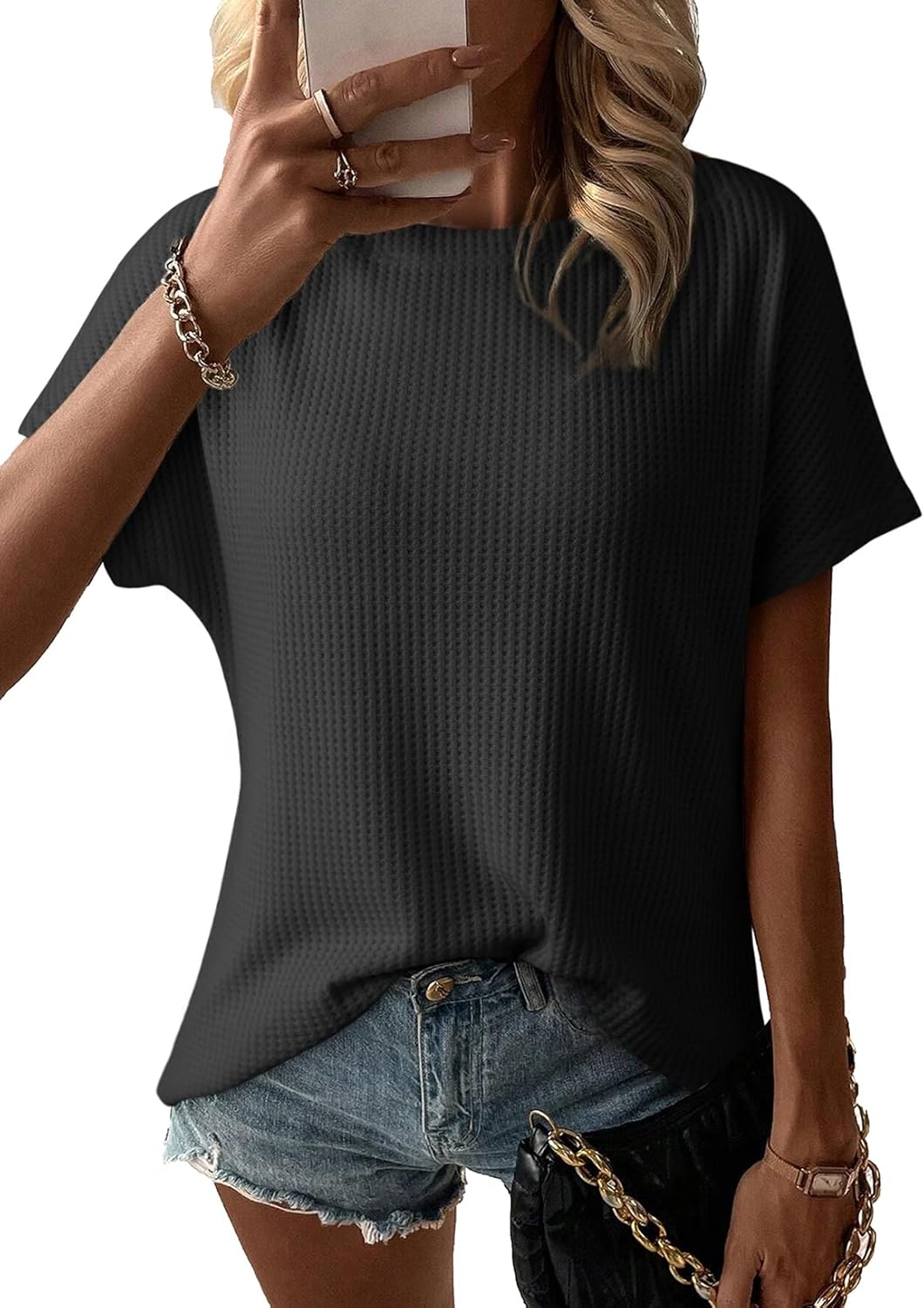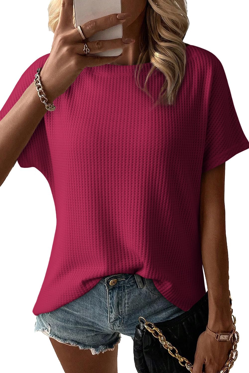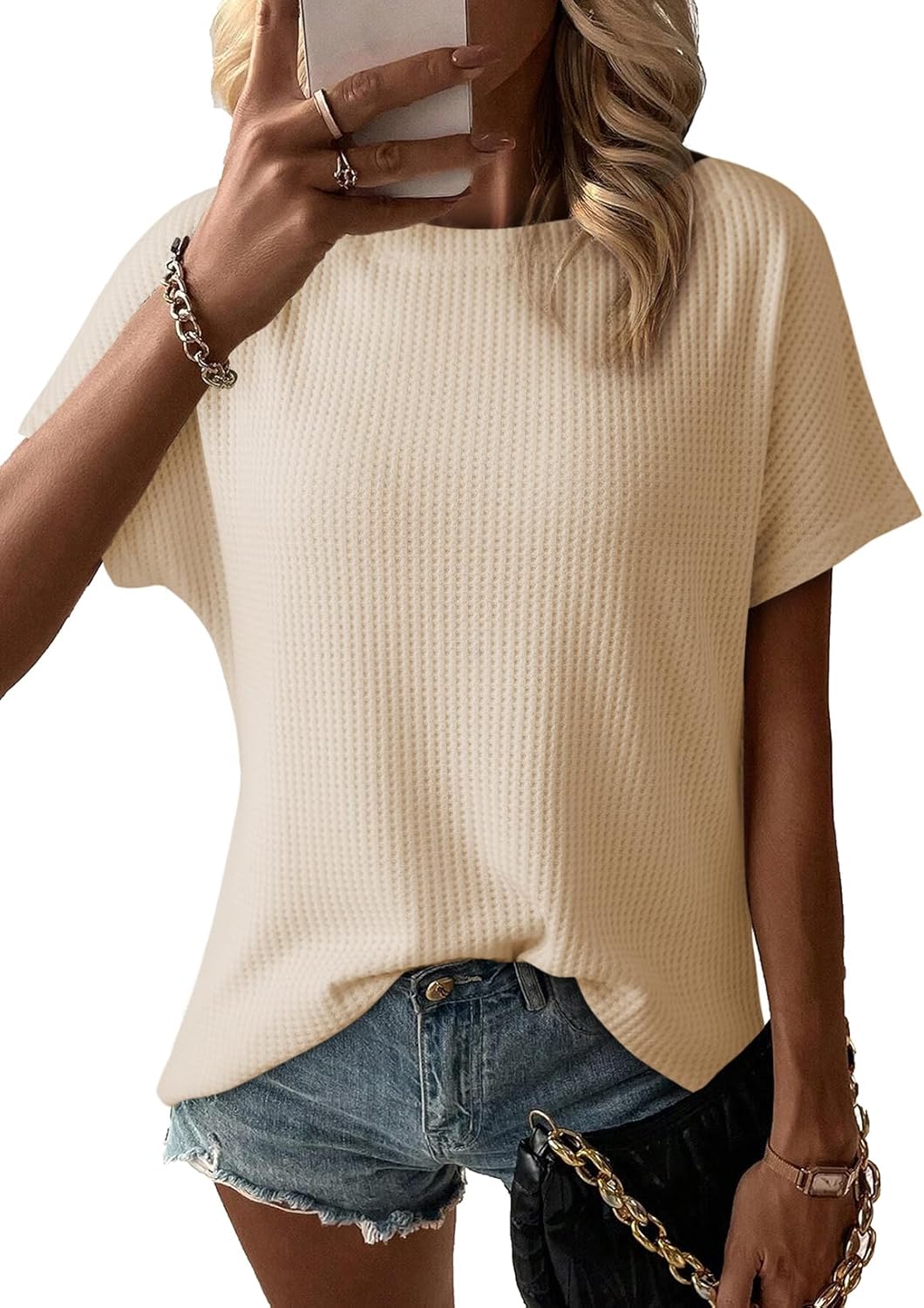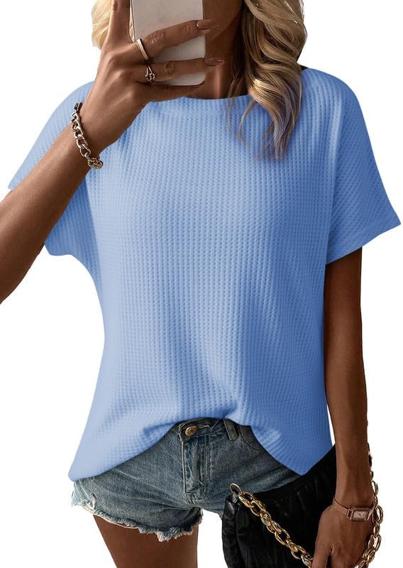 Dokotoo Women's Causual Boat Neck Short Sleeve Waffle Knit Shirts