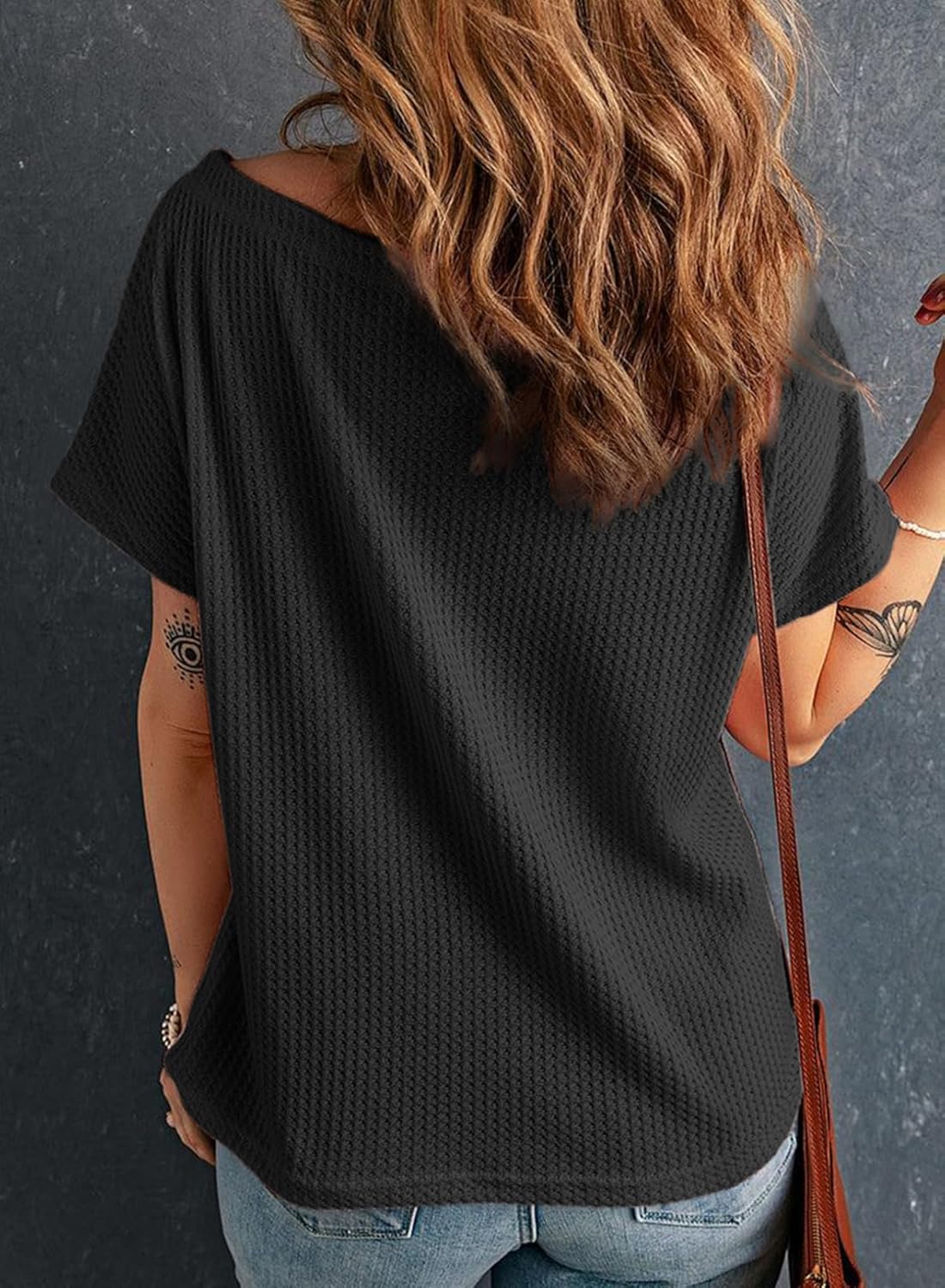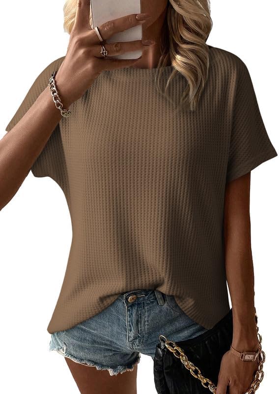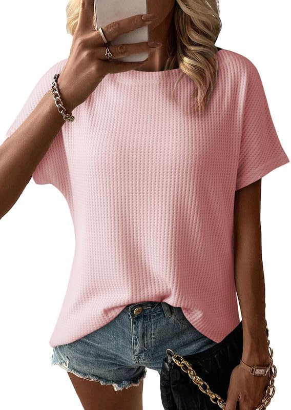 • Dokotoo Women's Casual Boat Neck Short Sleeve Waffle Knit Shirts Loose Summer Tunic Tops Blouses