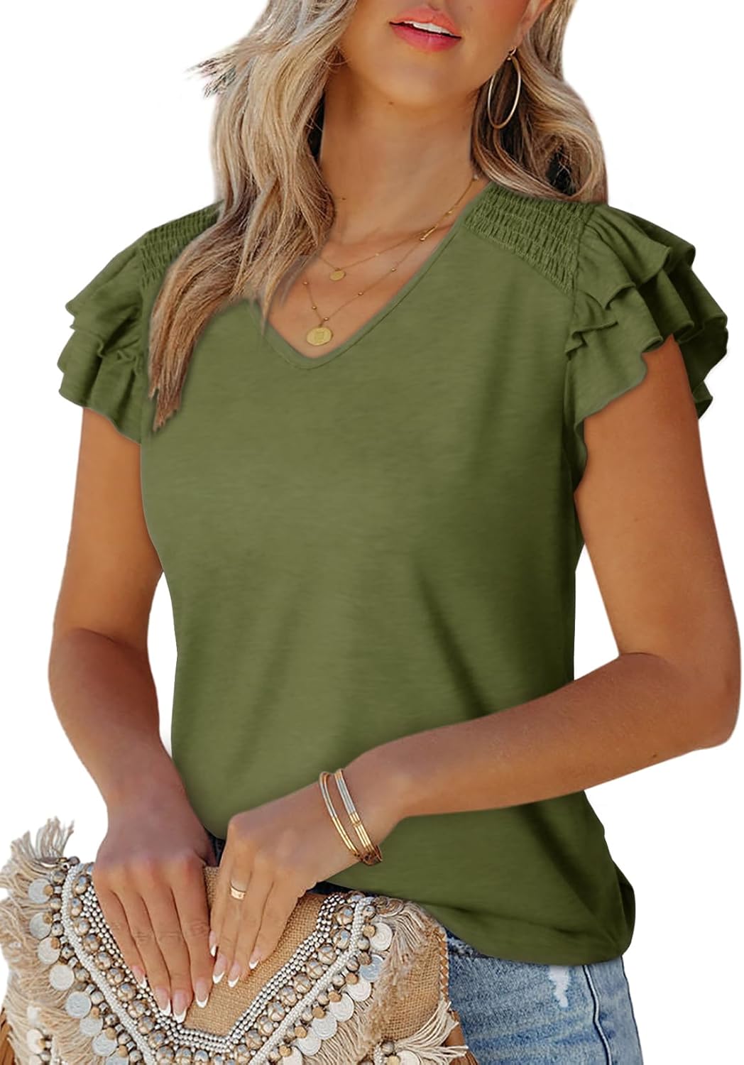 • Dokotoo Women's Casual Ruffle Short Sleeve Tops Cute Solid Color Knit Ribbed T Shirts Blouses