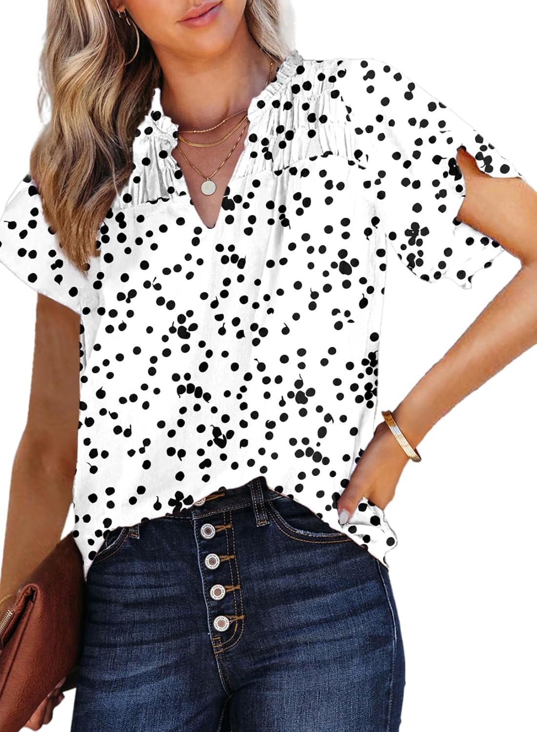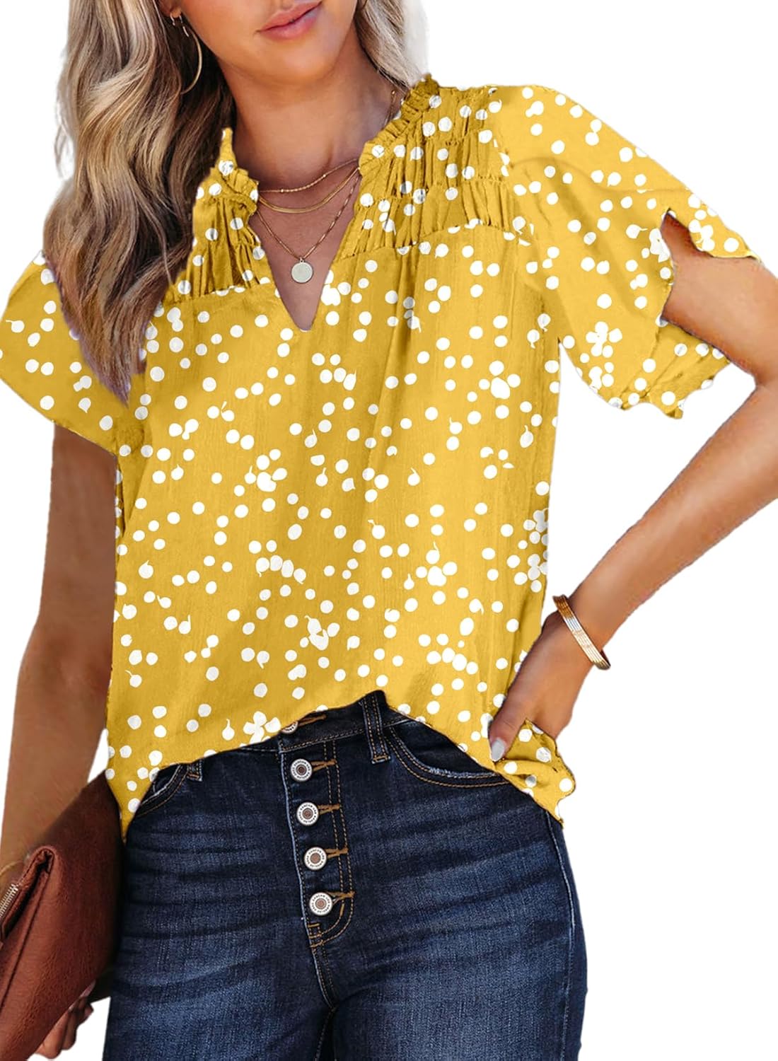 Dokotoo Women's Casual Alicia Floral Smocked Short Sleeve Blouses Bohemian Tops
