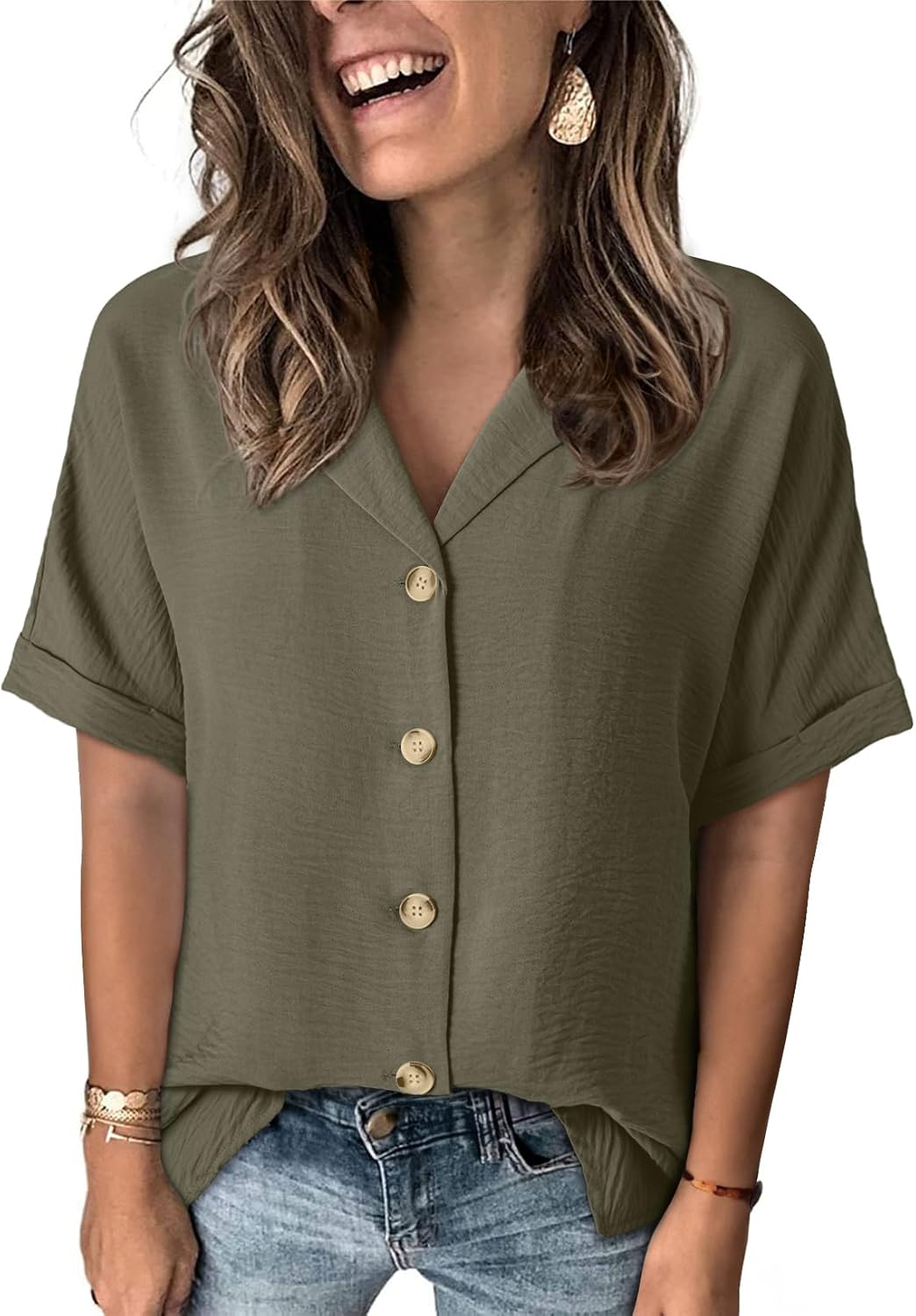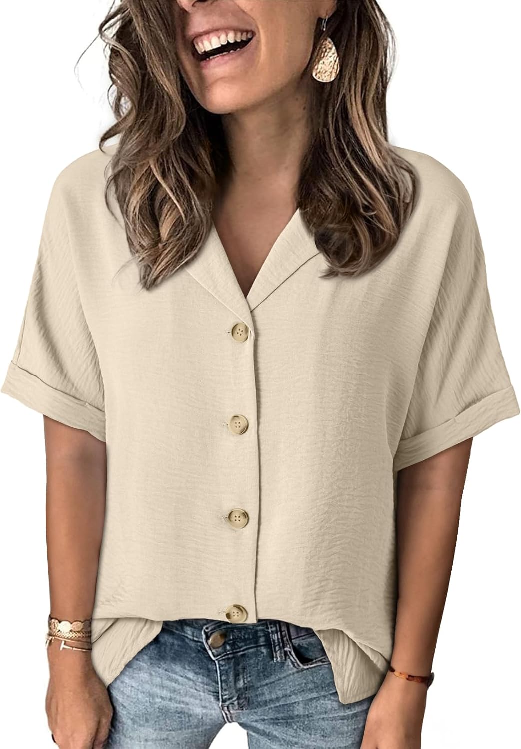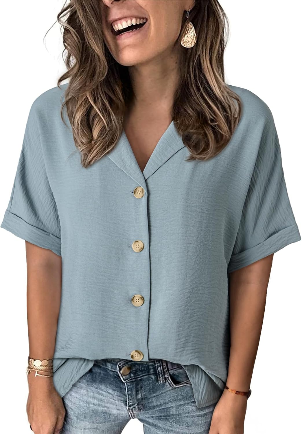 Dokotoo Women's Dressy Casual V Neck Short Sleeve Button Down Shirts Relaxed Work Business Loose Blouses Tops