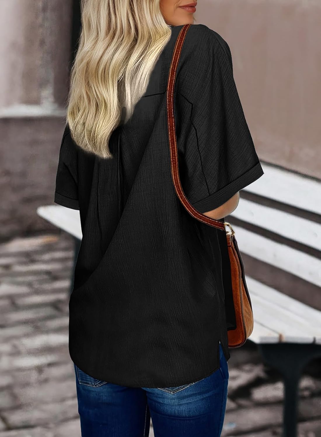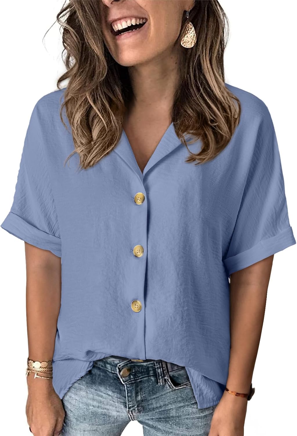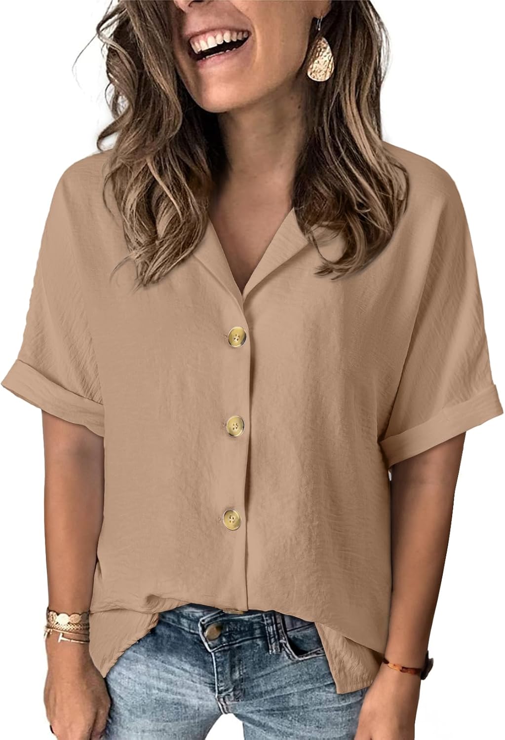 Dokotoo Women's Dressy Casual V Neck Short Sleeve Button Down Shirts Relaxed Work Business Loose Blouses Tops