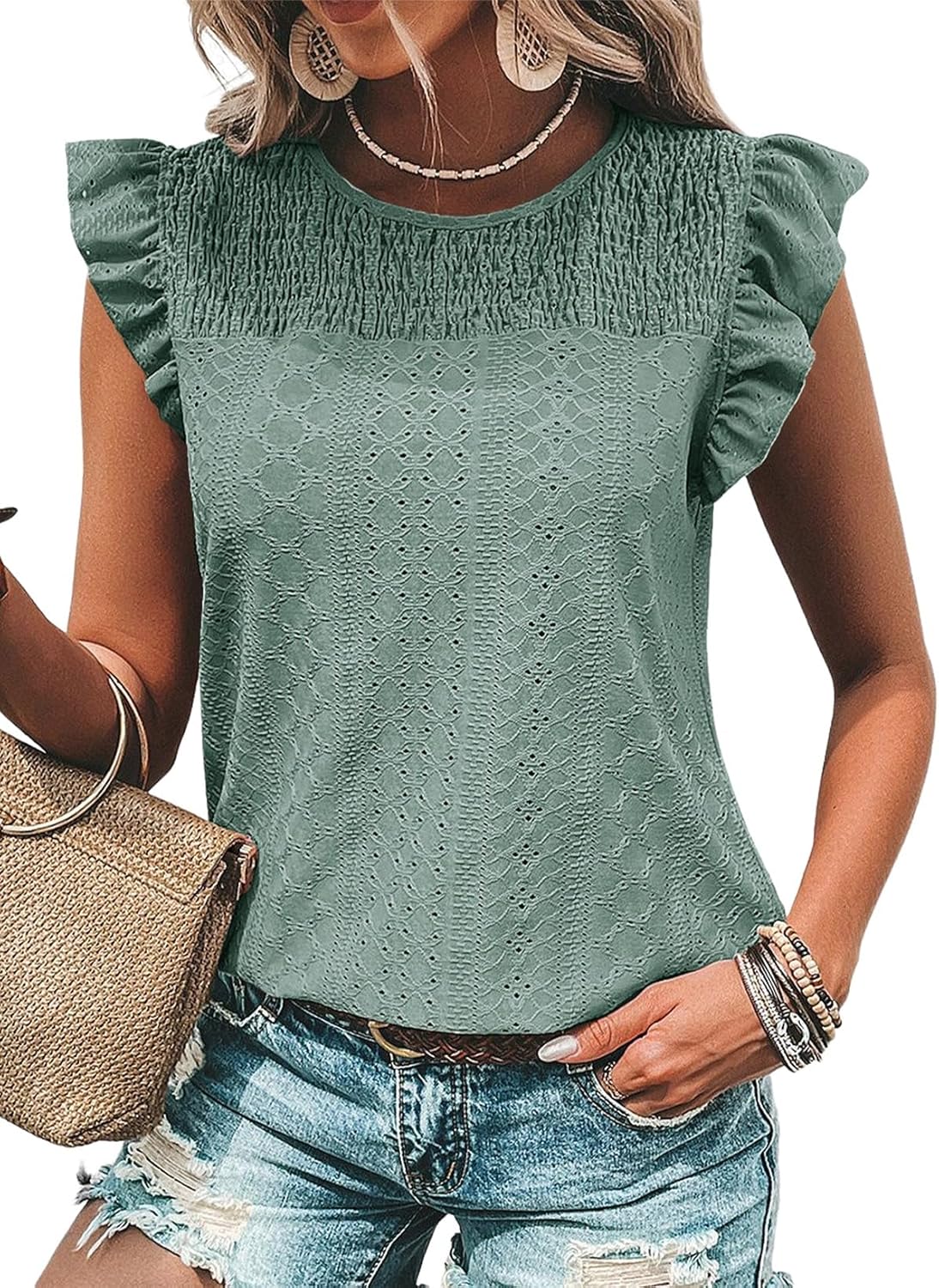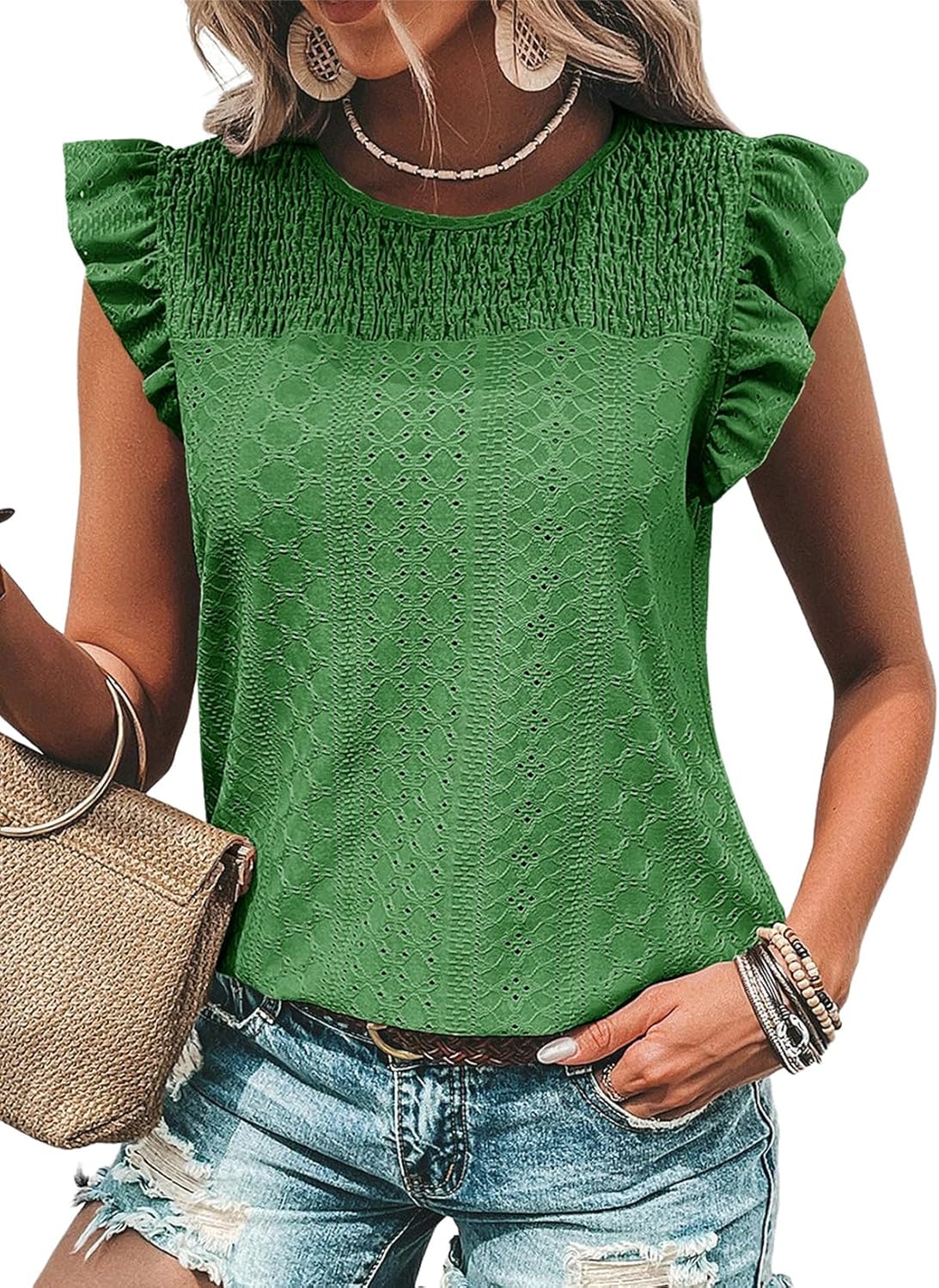 • Dokotoo Womens Summer Knit Tops 2025 Hollow Out Crewneck Cute Ruffle Short Sleeve Womens T Shirts Blouses