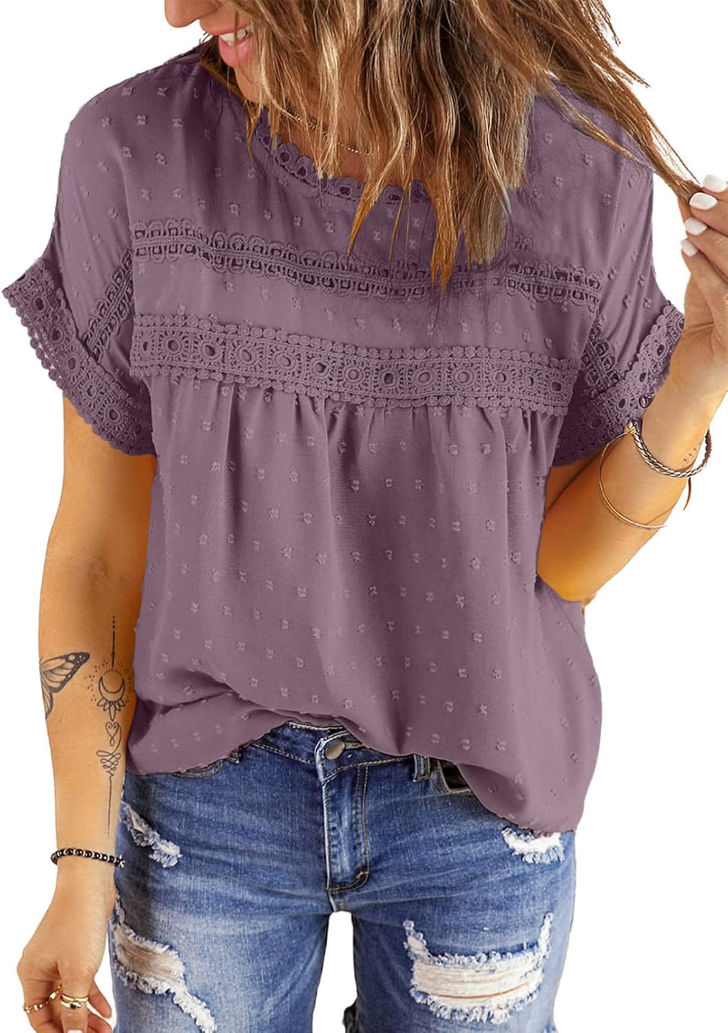 • Dokotoo Womens Summer Tops Crewneck Lace Crochet Short Sleeve Shirts Casual Chiffon Blouses