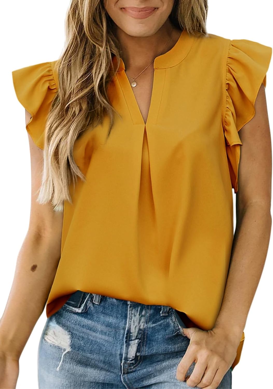 Dokotoo Womens Summer Tops Dressy Casual V Neck Ruffle Short Sleeve Solid Blouses Tops