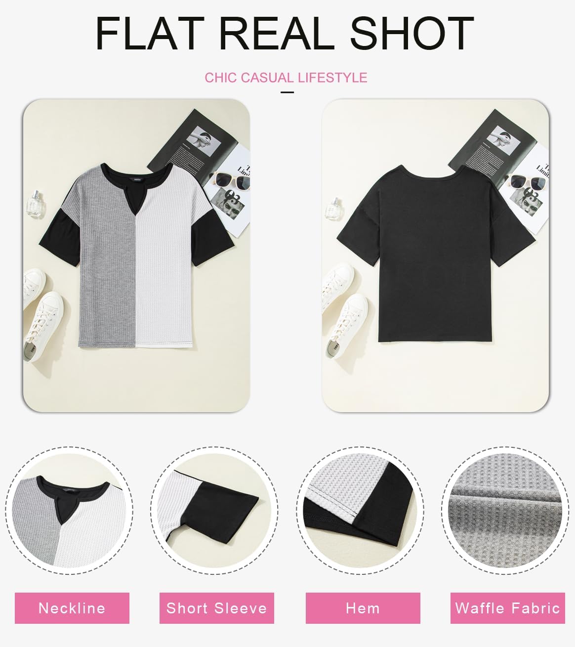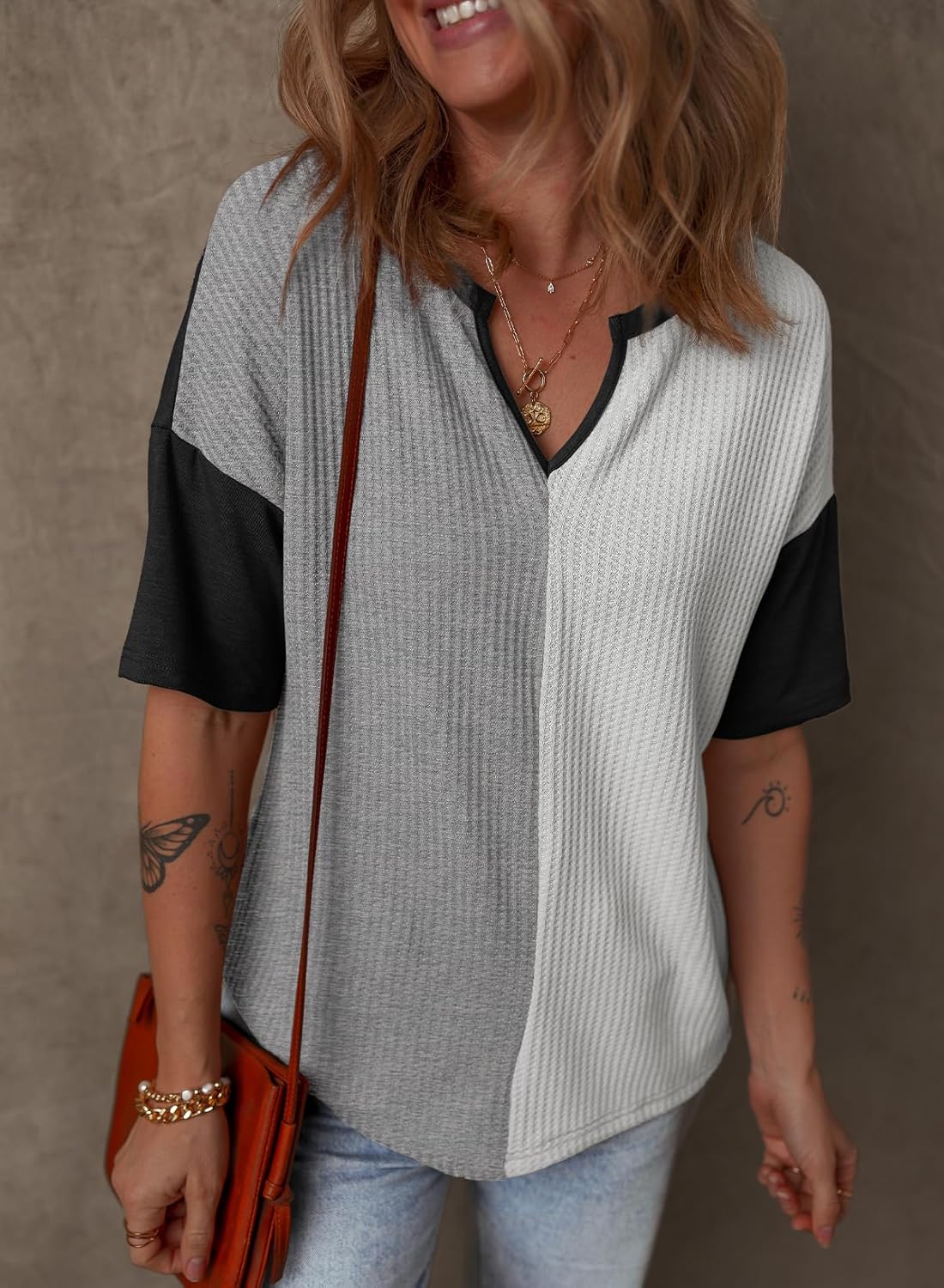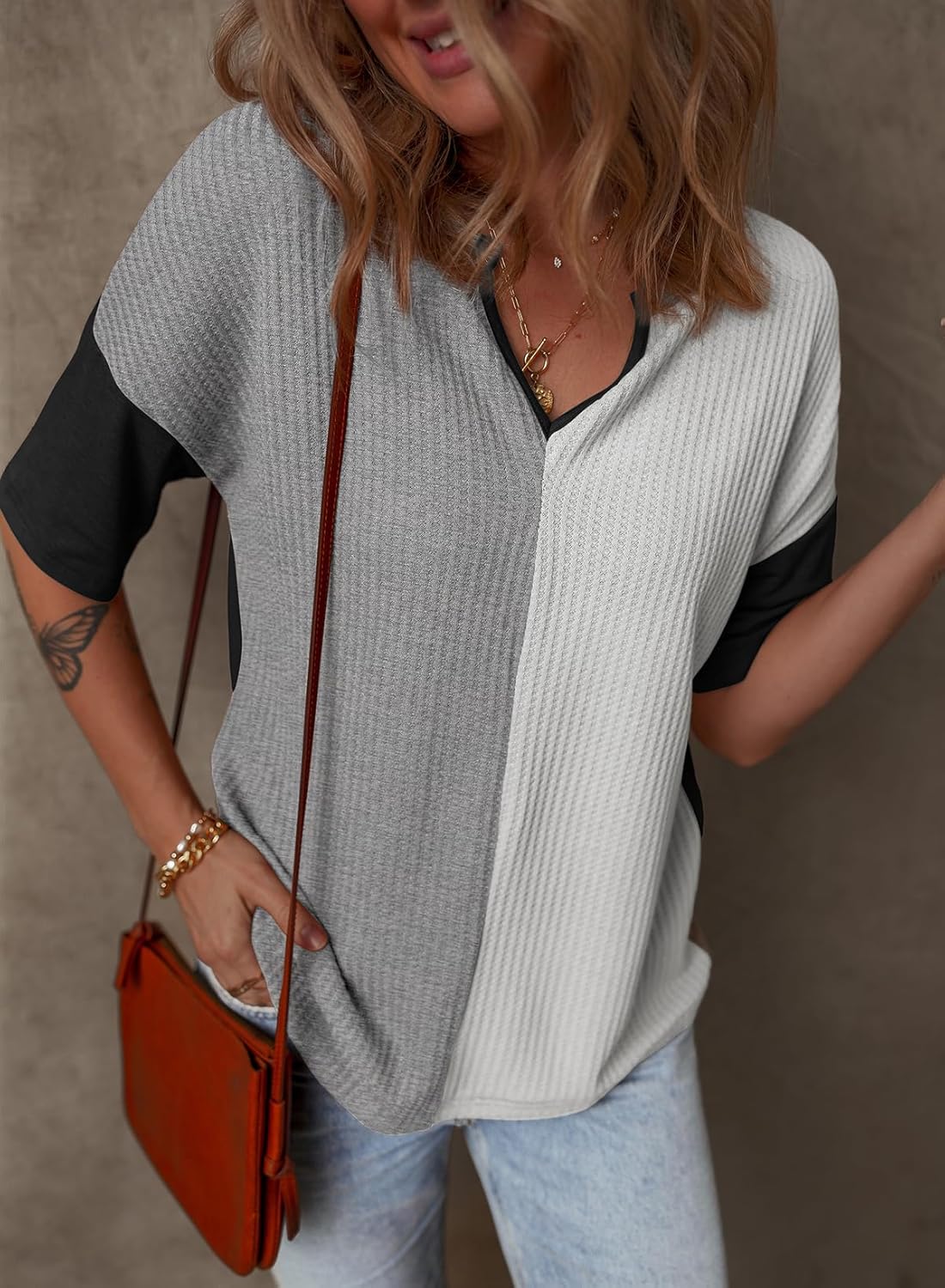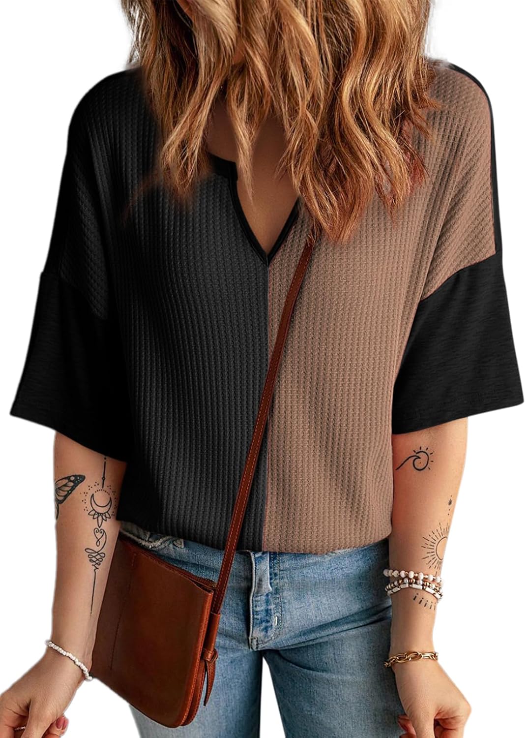 Dokotoo Half Sleeve Waffle Knit V Neck Patchwork Blouses