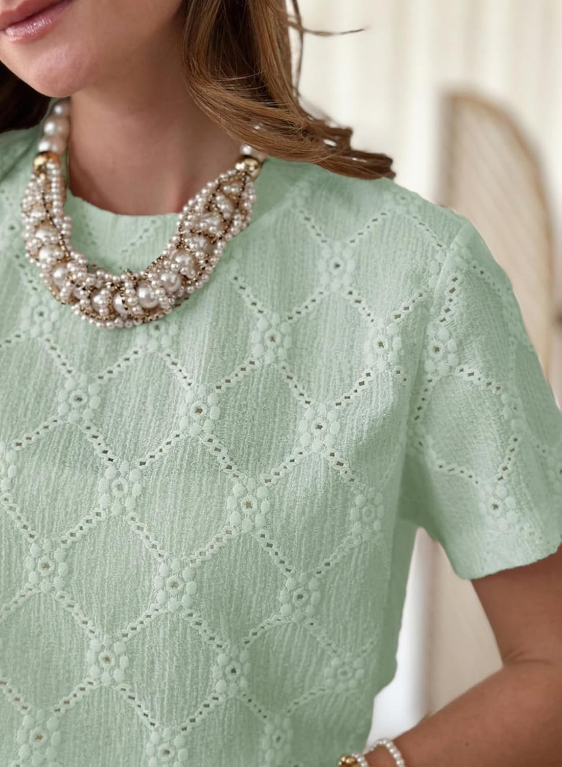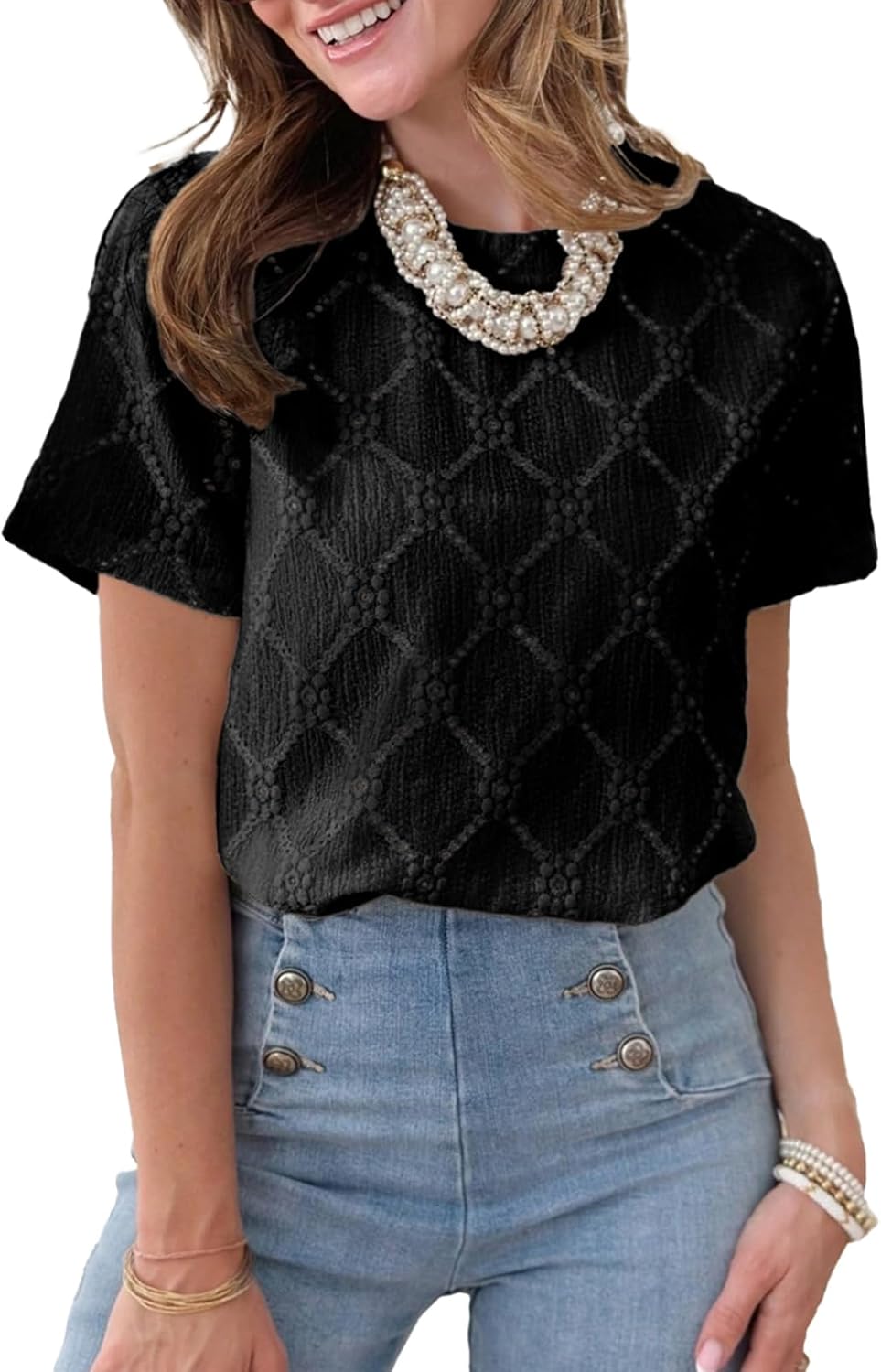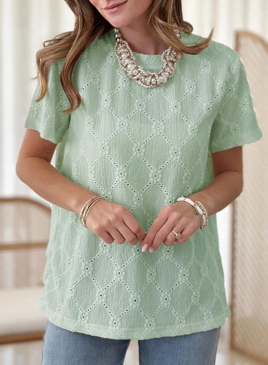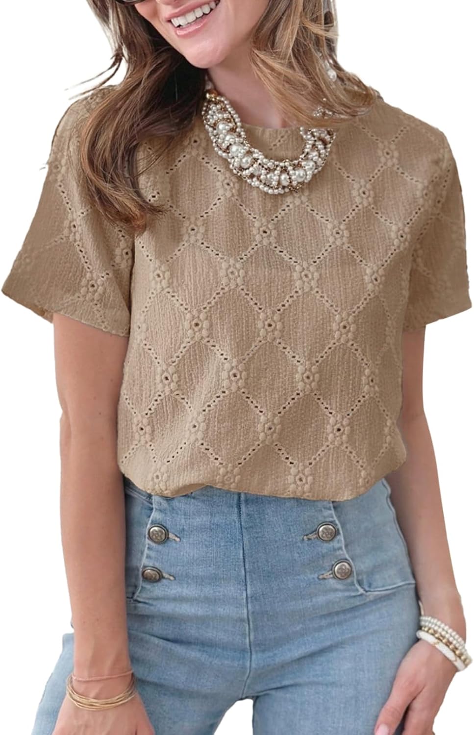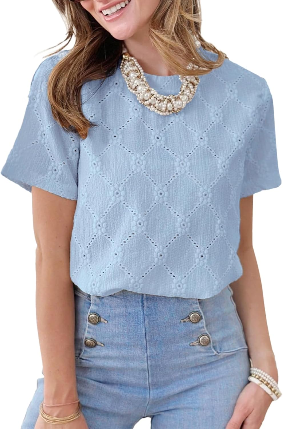 Dokotoo Women's Tops Casual Scoop Neck Short Sleeve Eyelet Embroidered Hollow Out Blouses Shirts