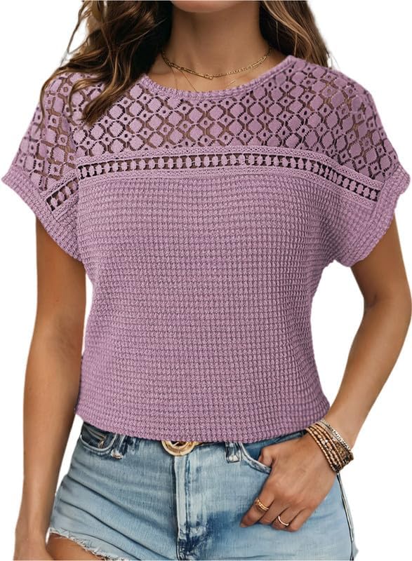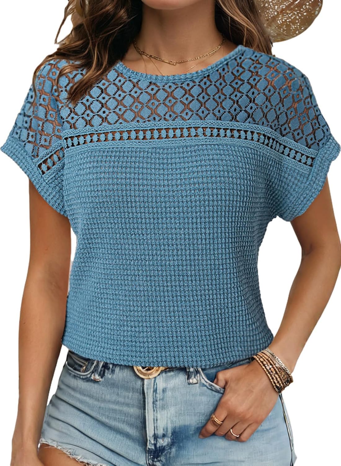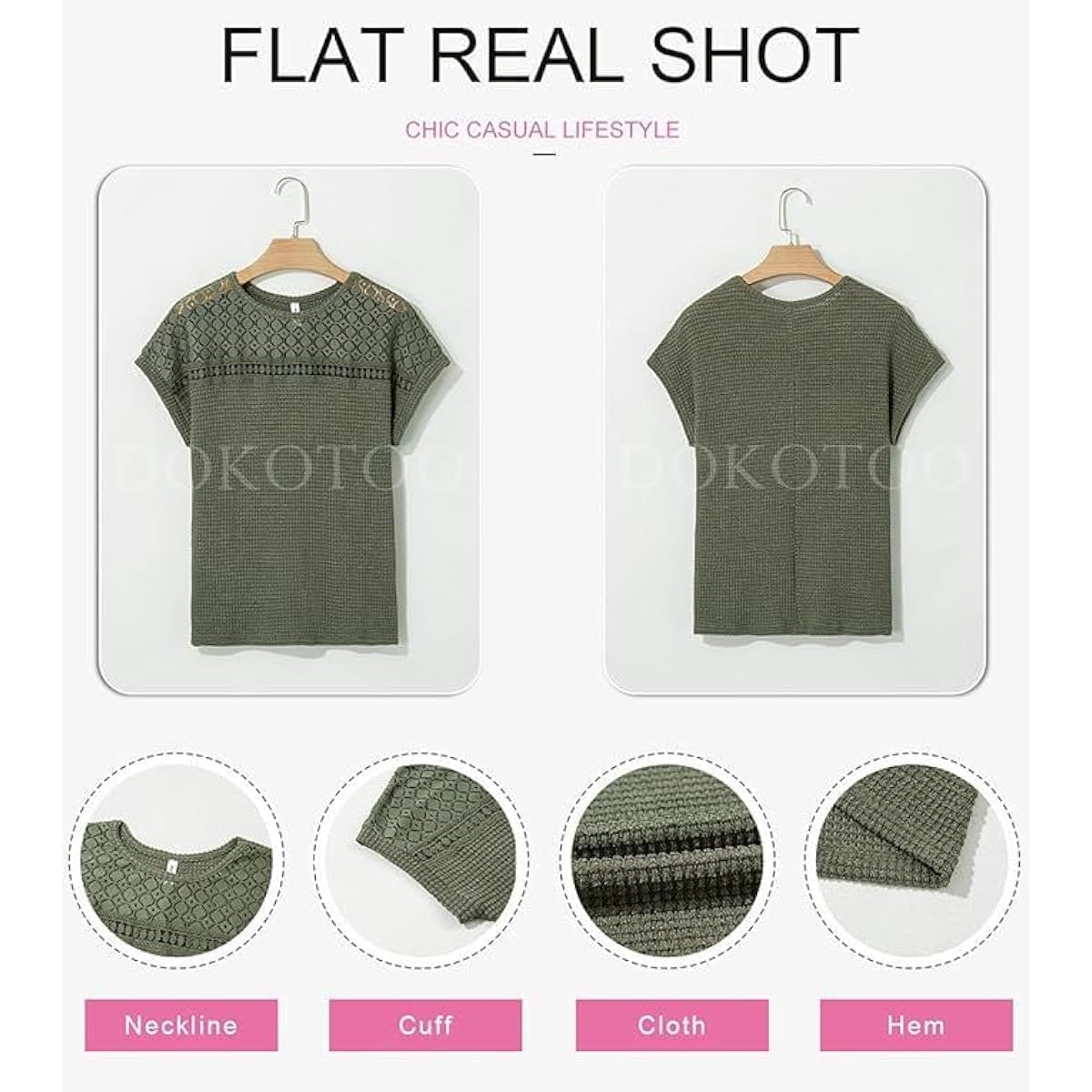 Dokotoo Women's Tops Casual Scoop Neck Short Sleeve Waffle Knit Hollow Out Shirts Loose Tunic Tops Blouses