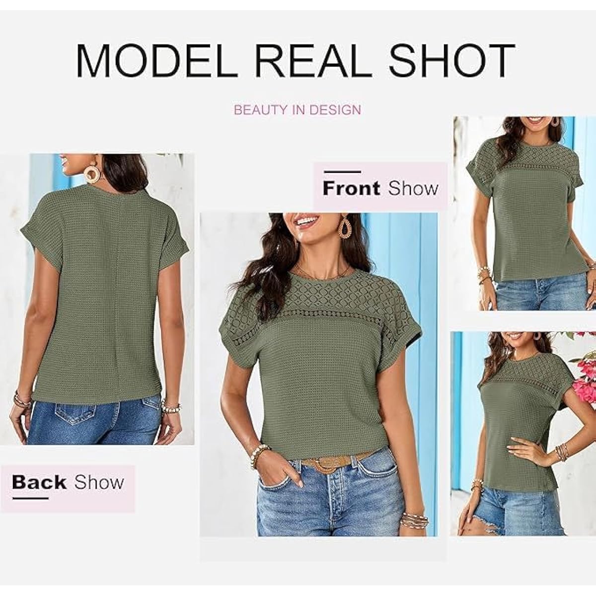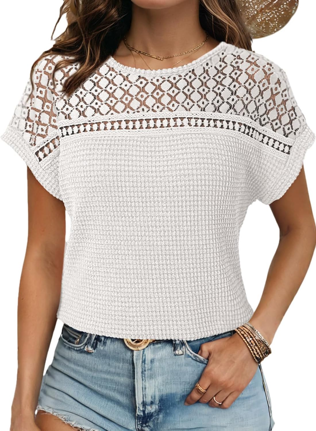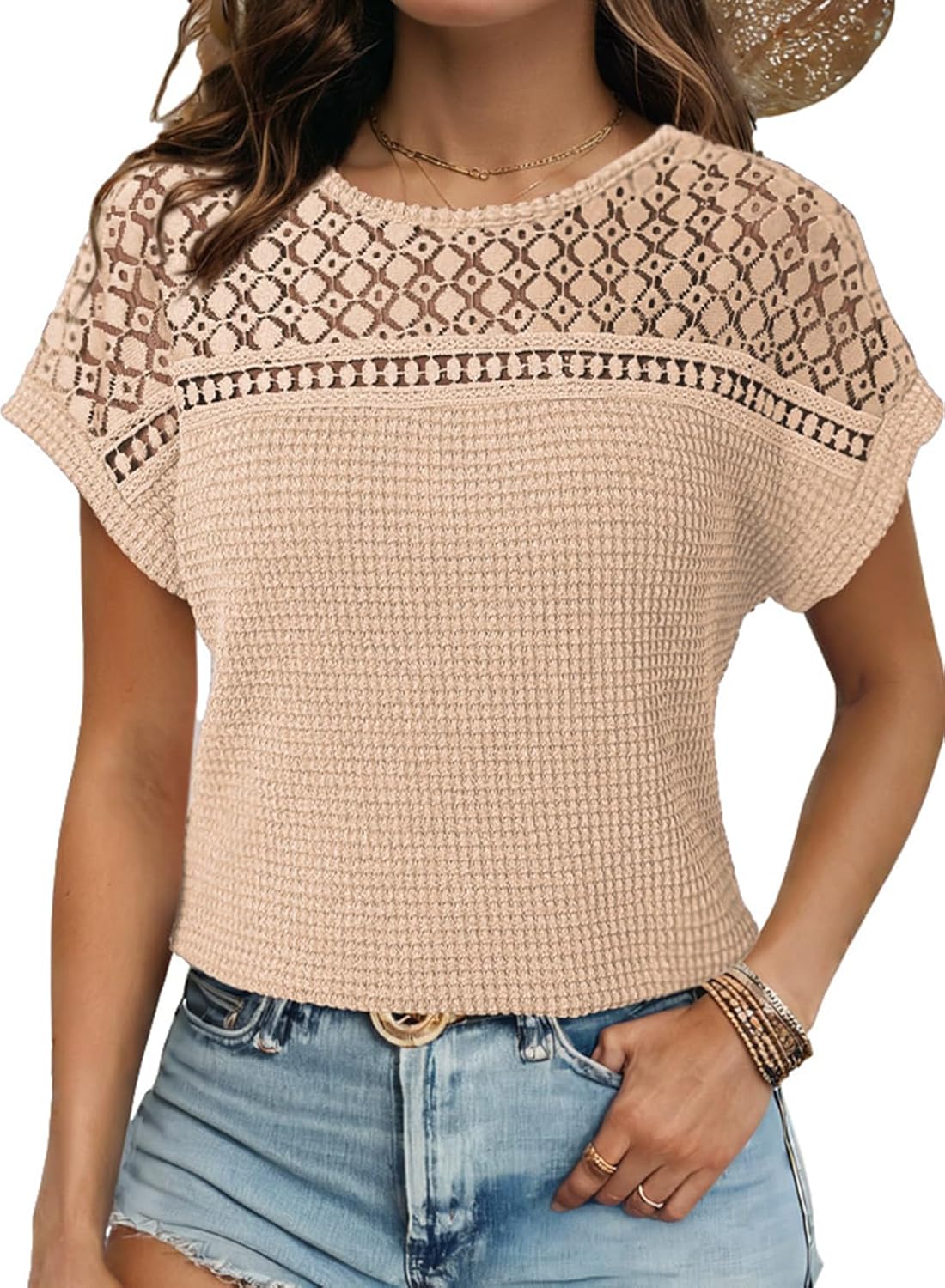 Dokotoo Women's Tops Casual Scoop Neck Short Sleeve Waffle Knit Hollow Out Shirts Loose Tunic Tops Blouses