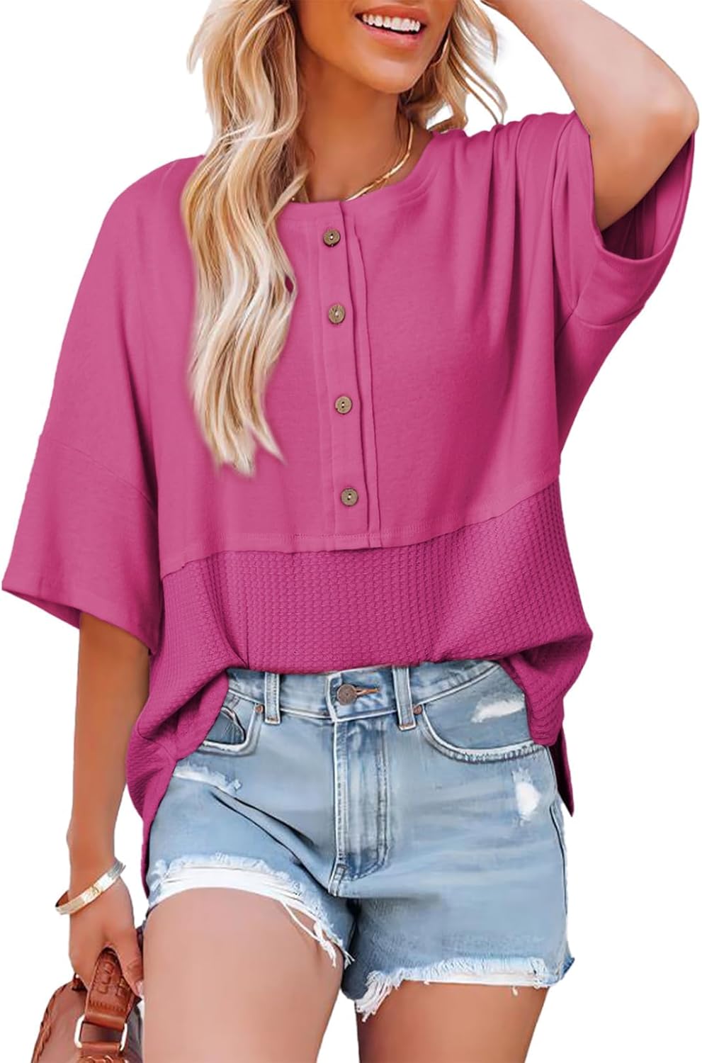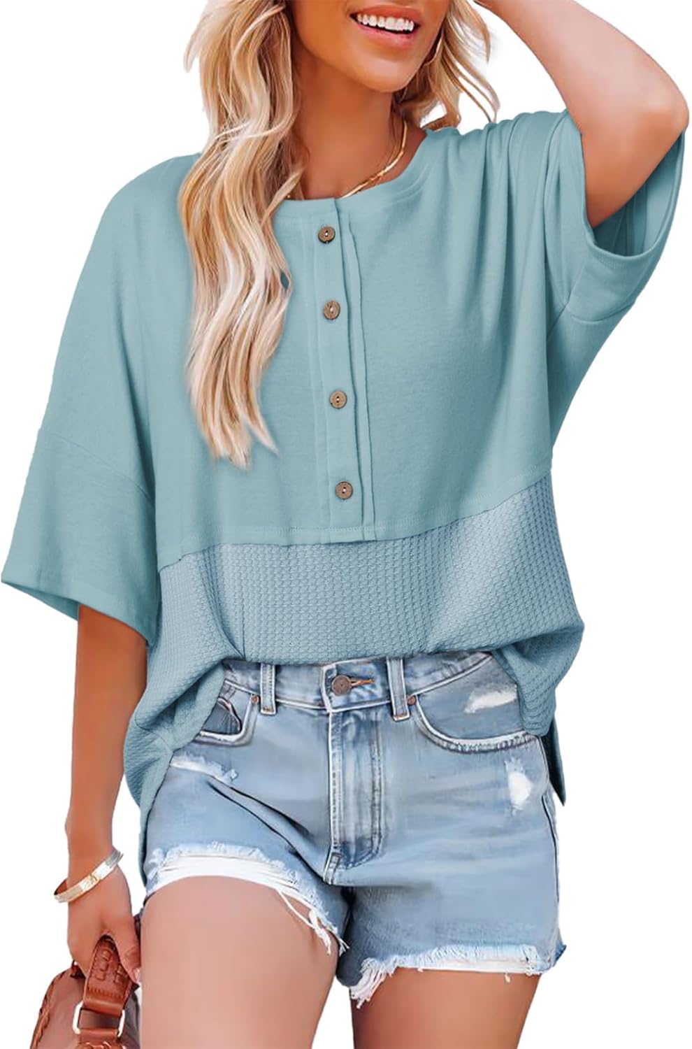 Dokotoo 3/4 Sleeve Casual Crew Neck Button Down Waffle Knit Tops