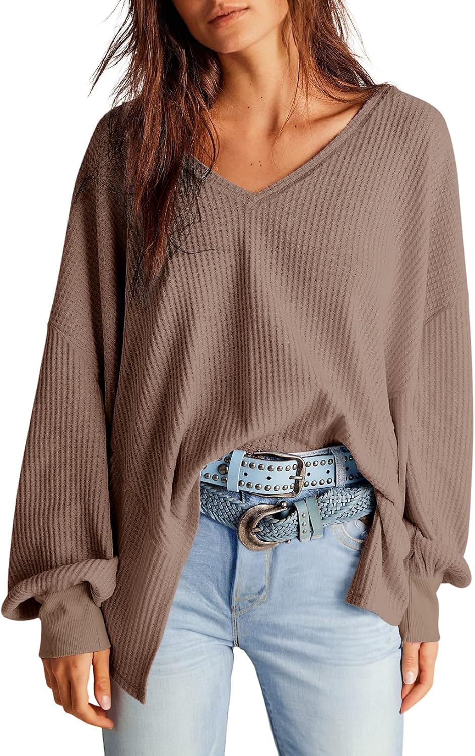 • Dokotoo Womens Waffle Knit Tops Fashion 2025 Long Lantern Sleeve Casual Blouses V Neck Oversized T Shirts