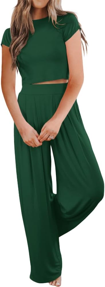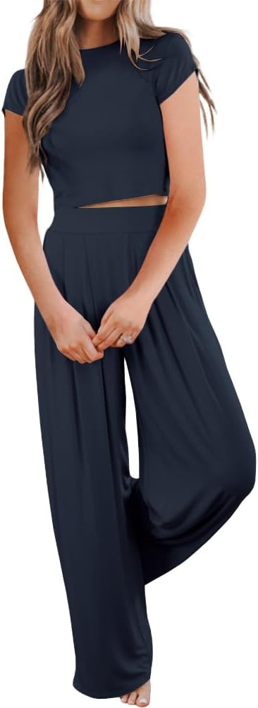Women's 2 Piece Lounge Outfits Short Sleeve Knit Pullover Cropped Tops