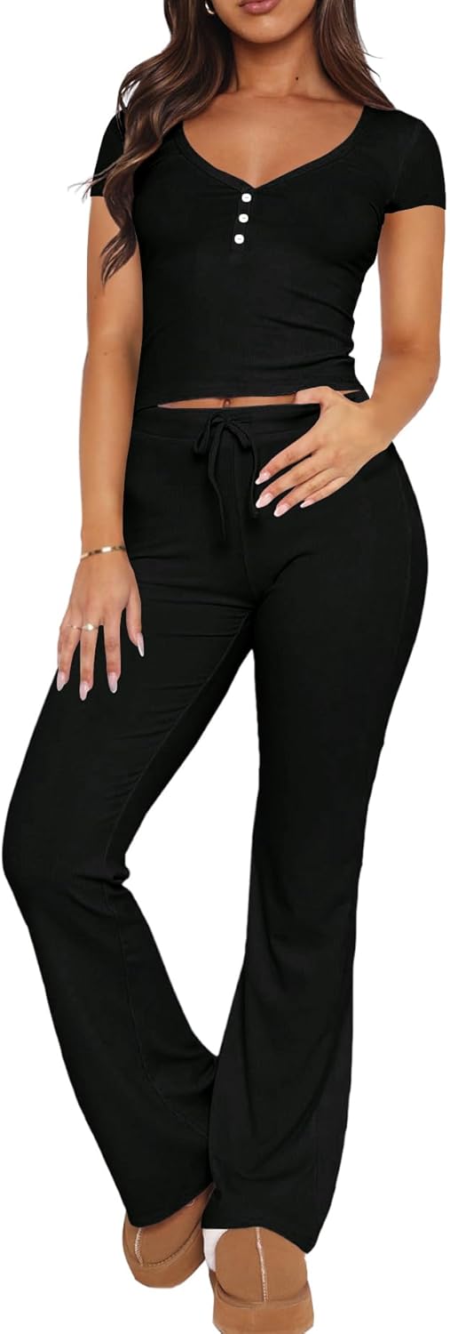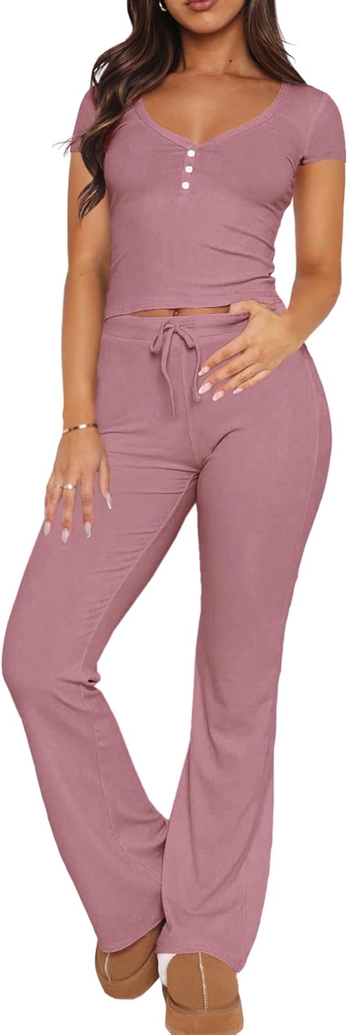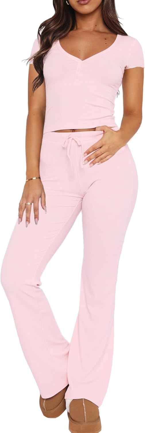 Women's V Neck Crop Top Bibbed Knit Shirt and Two Piece Outfit Summer Pjs Sets