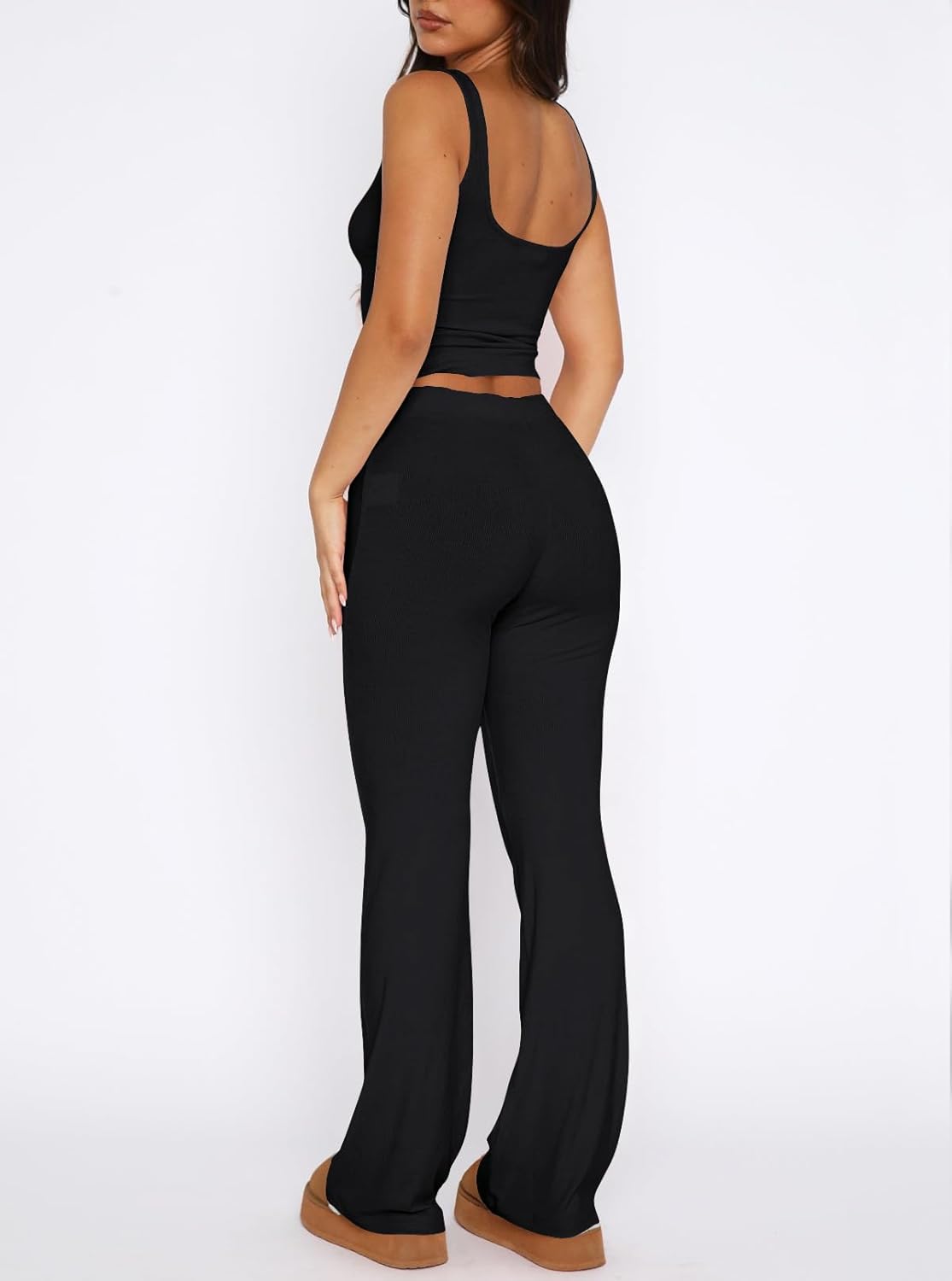 Crop tank shirt for women, this black knit lounge set transitions seamlessly from workouts to lounging. The breathable, stretchy fabric keeps you comfy during sports, while the sleek two-piece design highlights your silhouette sporty sexy soft two piece outfits sets summer Pjs set