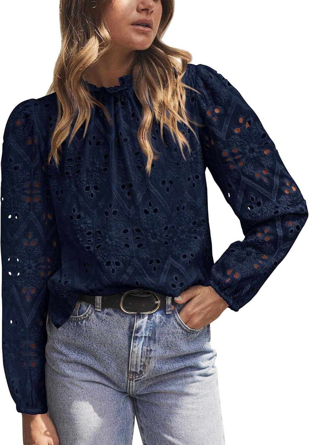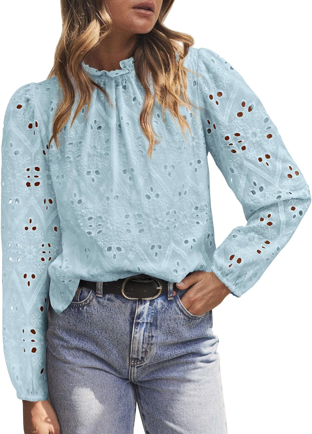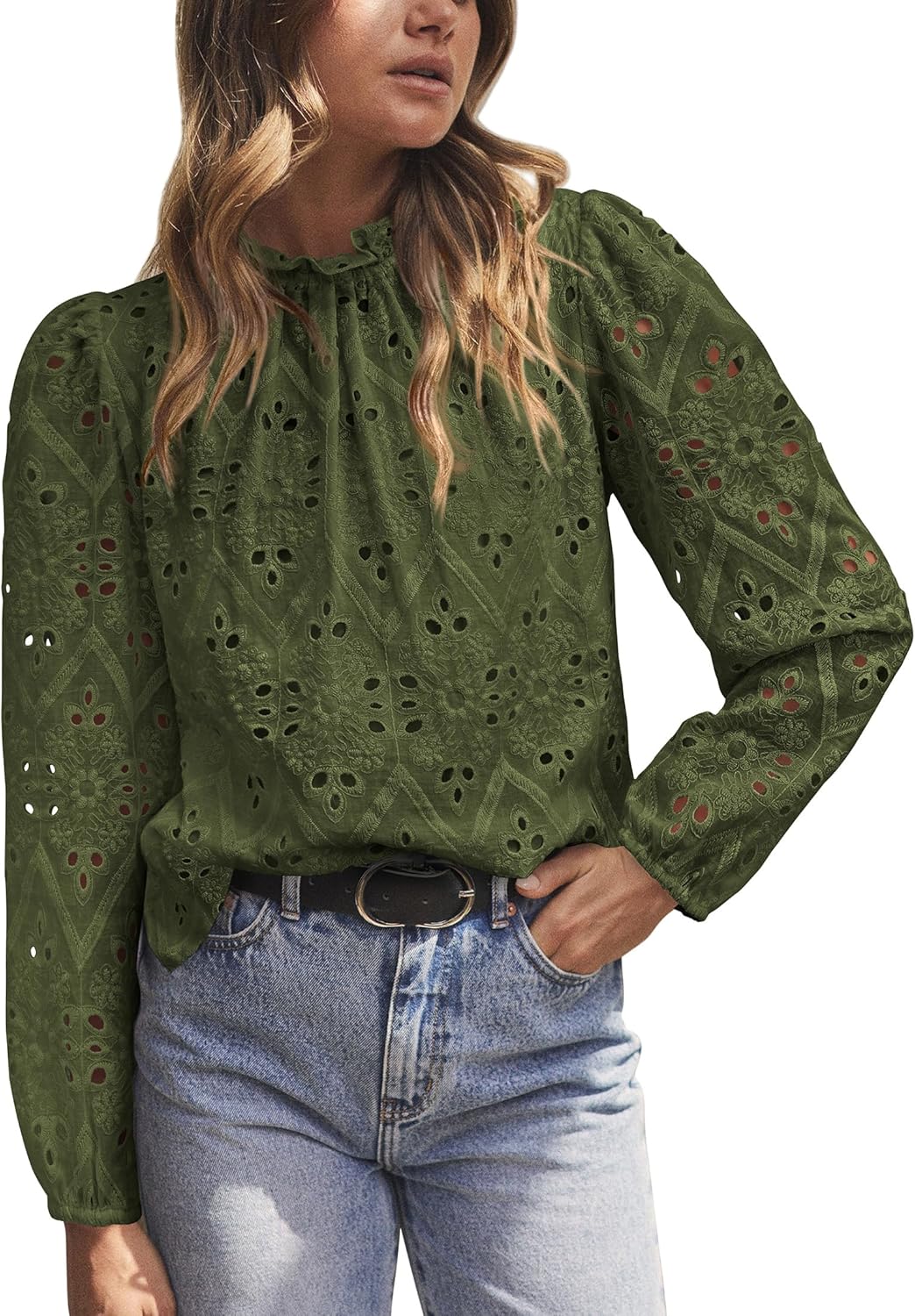 PRETTYGARDEN Women's Long Sleeve Tops Casual Crew Neck Eyelet Blouse
