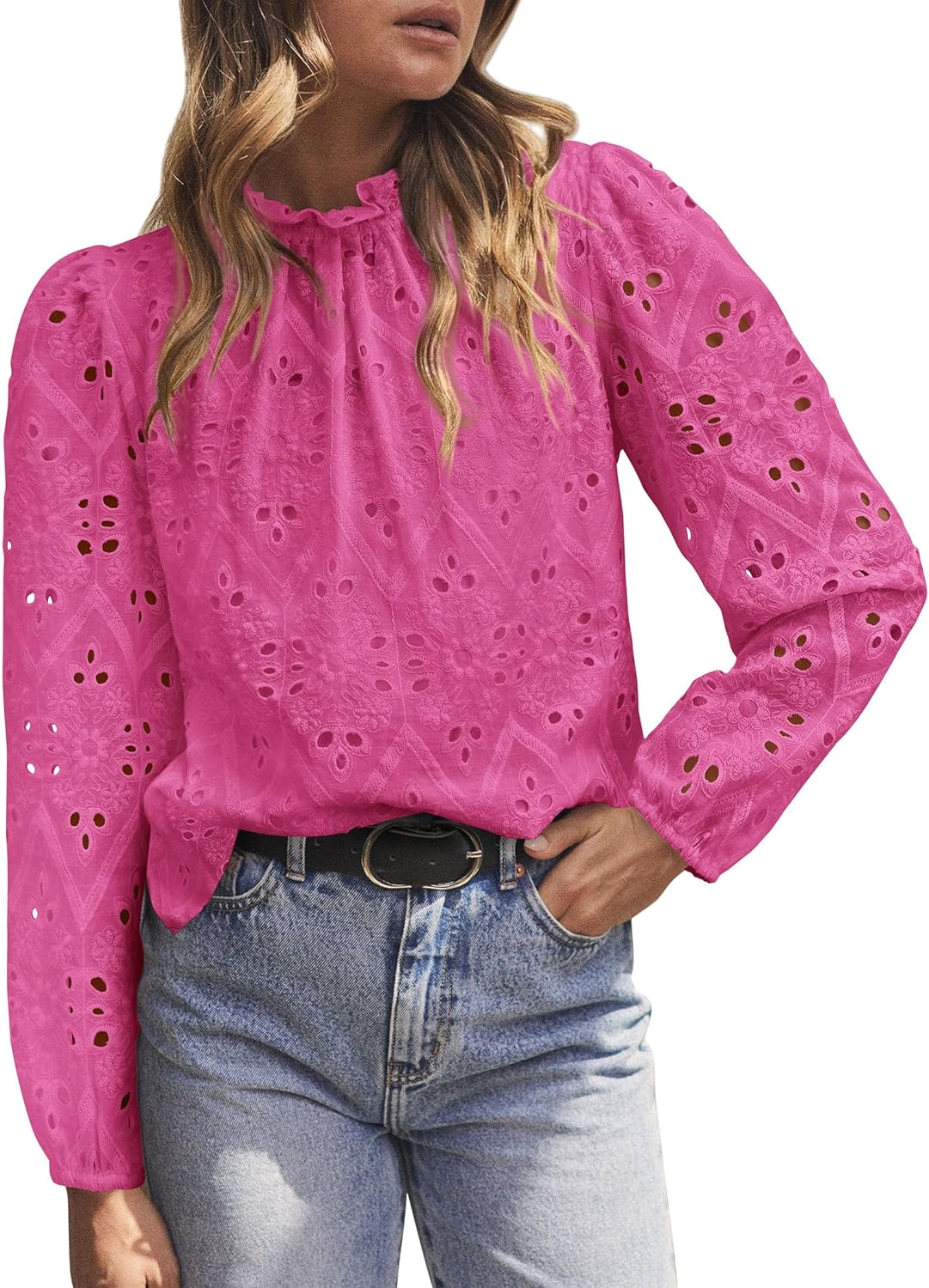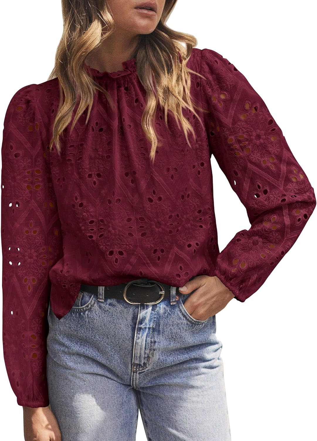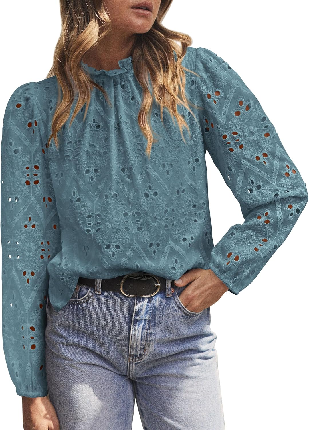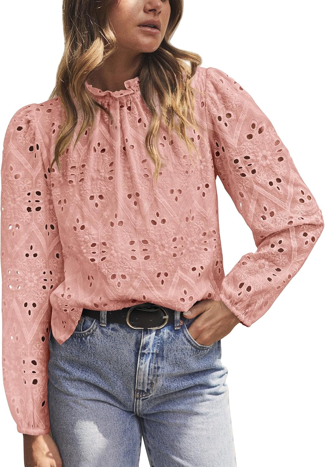 PRETTYGARDEN Women's Long Sleeve Tops Casual Crew Neck Eyelet Blouse