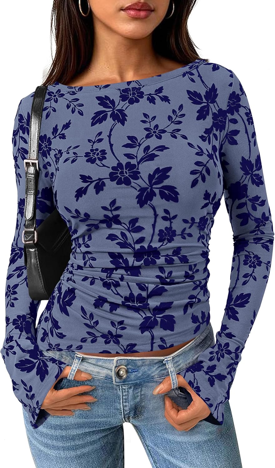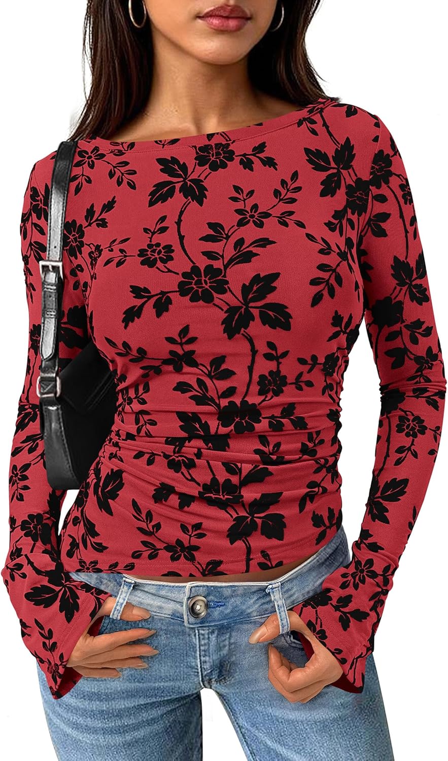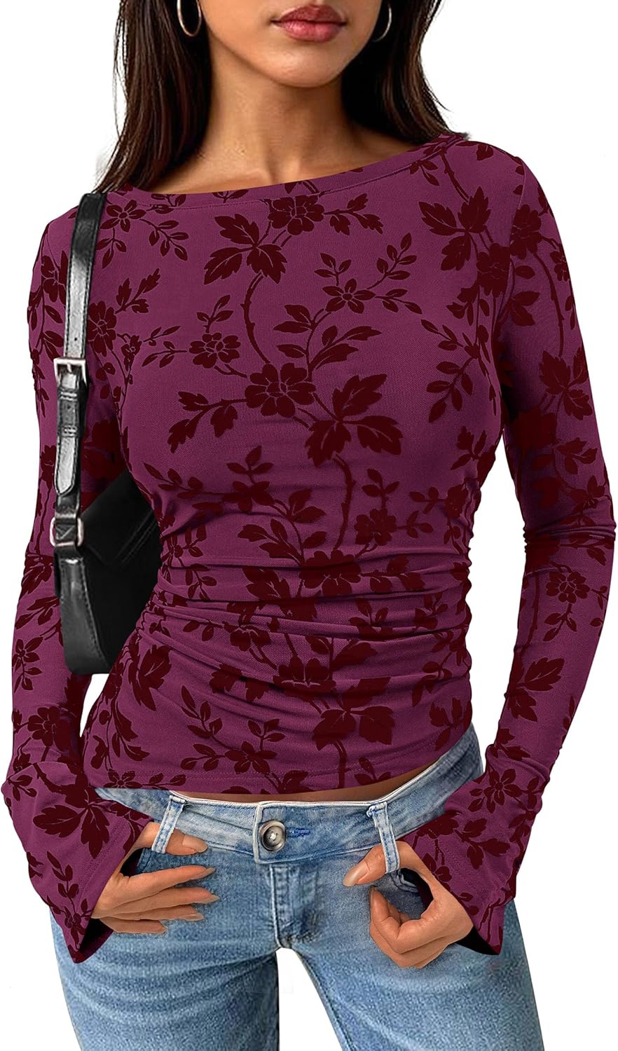 PRETTYGARDEN Women's Long Sleeve Mesh Tops Casual Boat Neck Fitted Shirts
