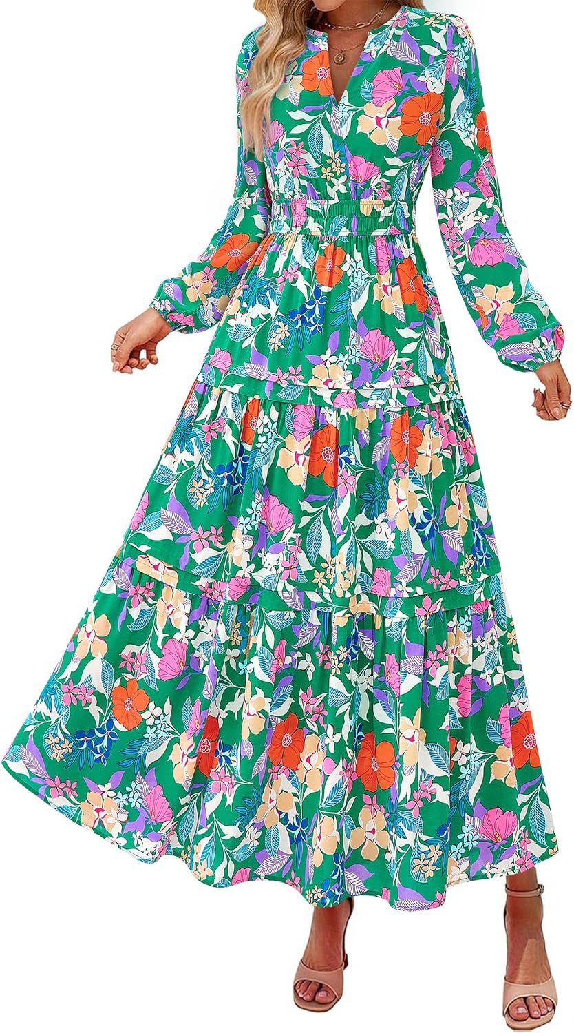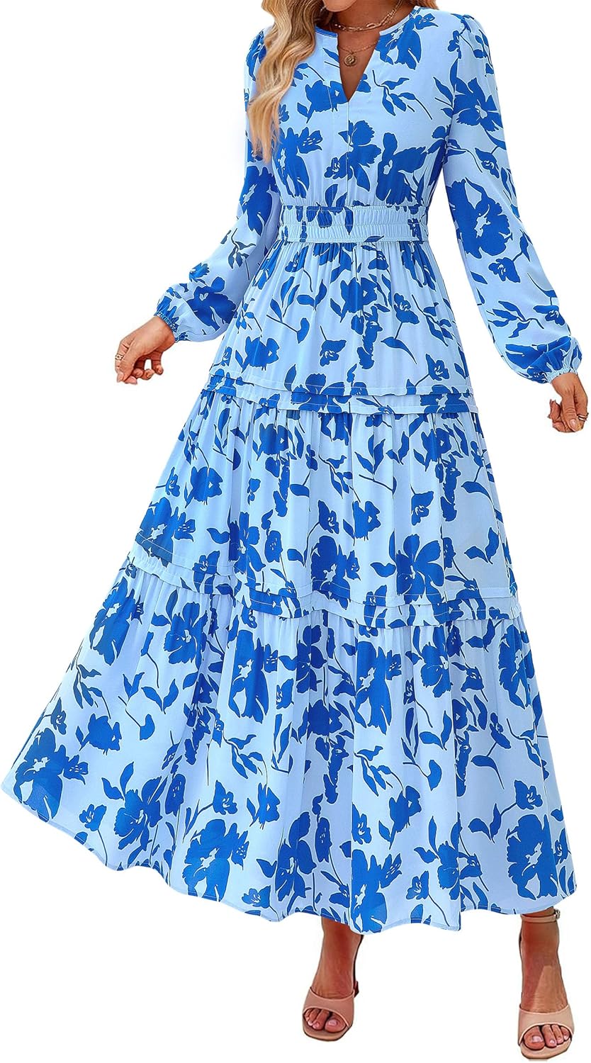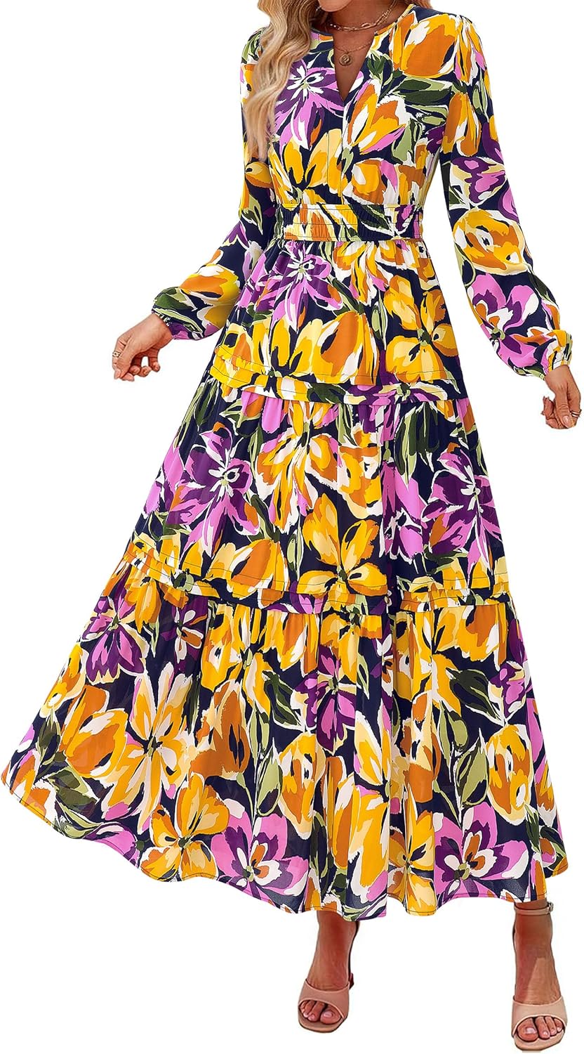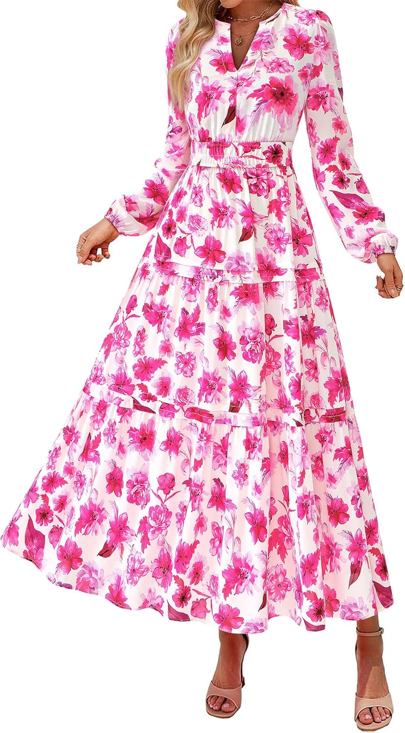 PRETTYGARDEN Women Fall Dresses Floral Long Sleeve V Neck Maxi Dress