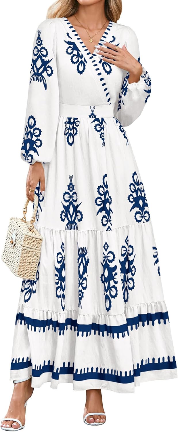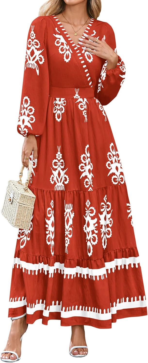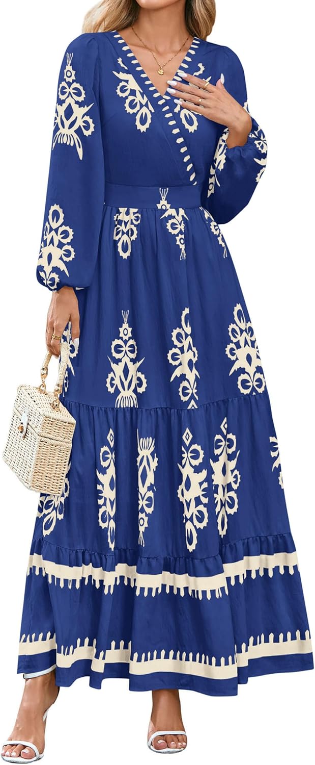 • PRETTYGARDEN Women's 2025 Fall Wedding Guest Dresses Boho Floral Long Sleeve V Neck Flowy Elegant Maxi Dress Beach Clothes