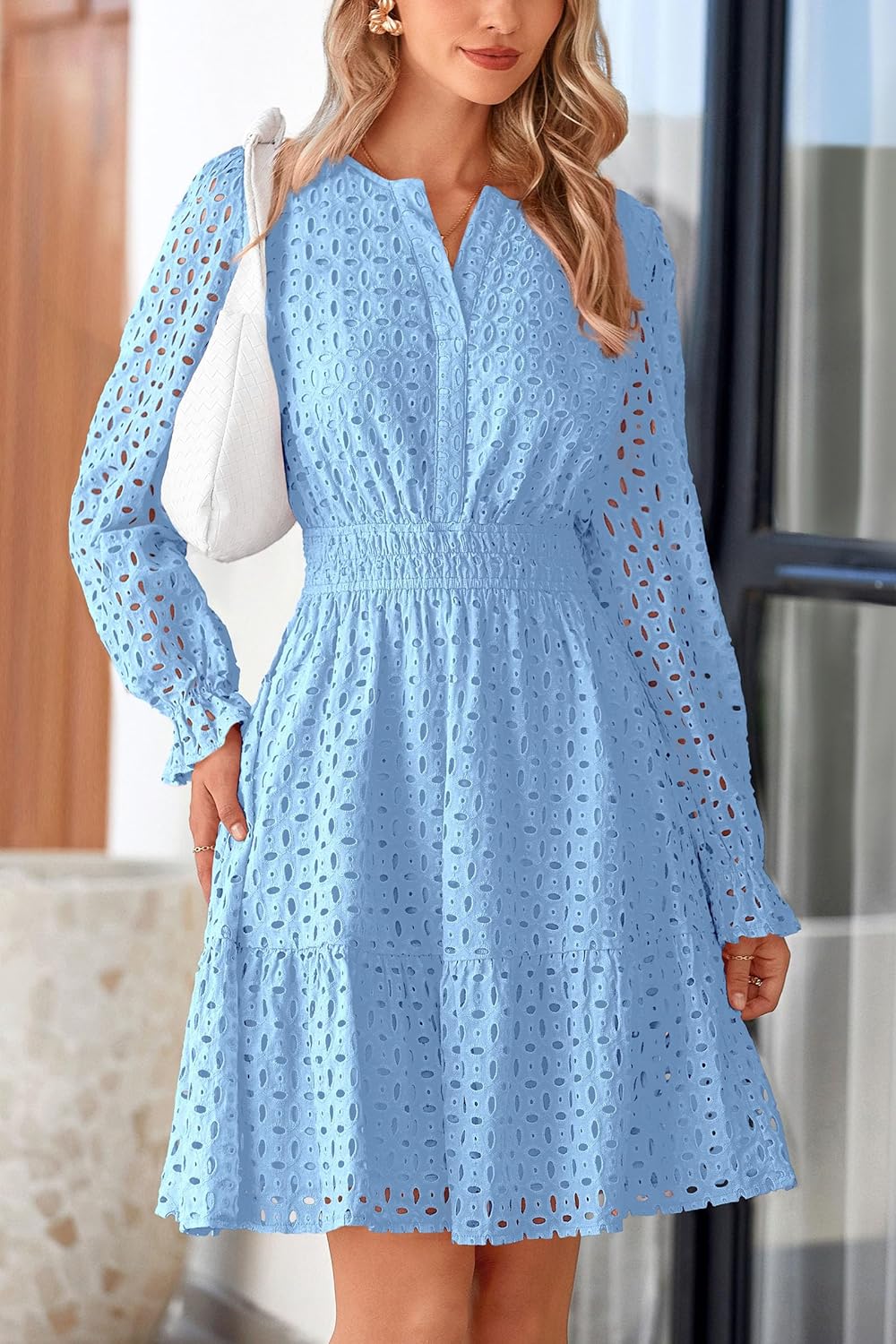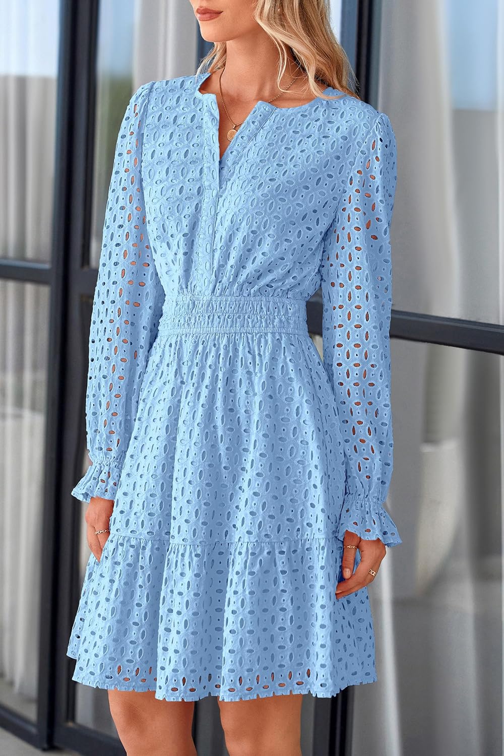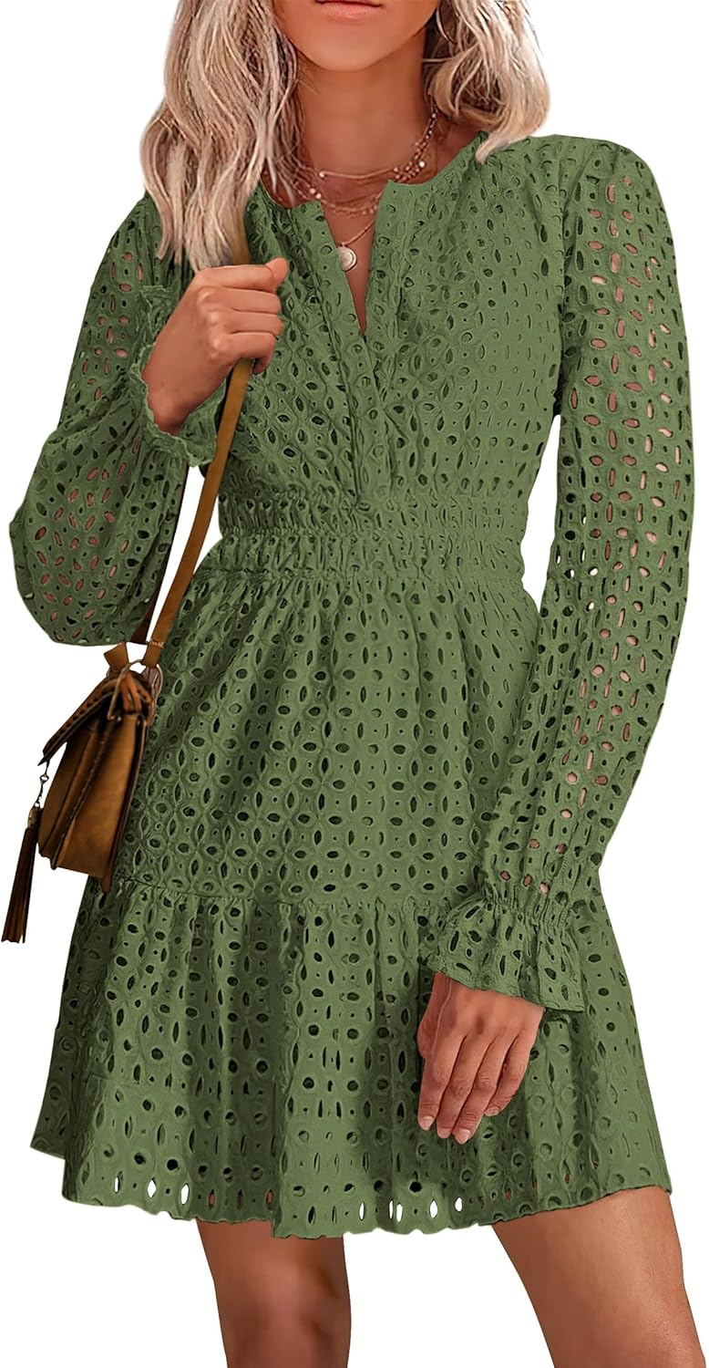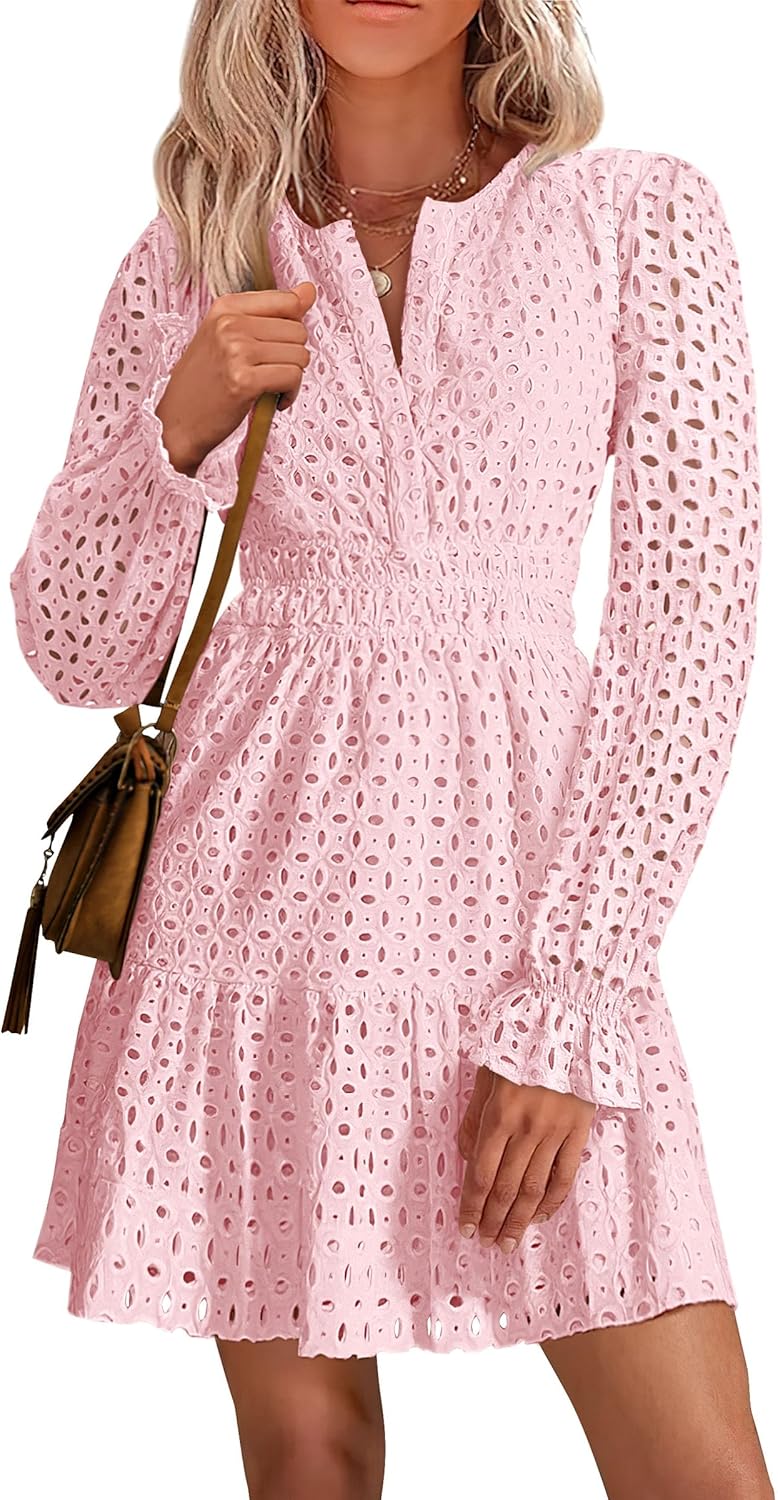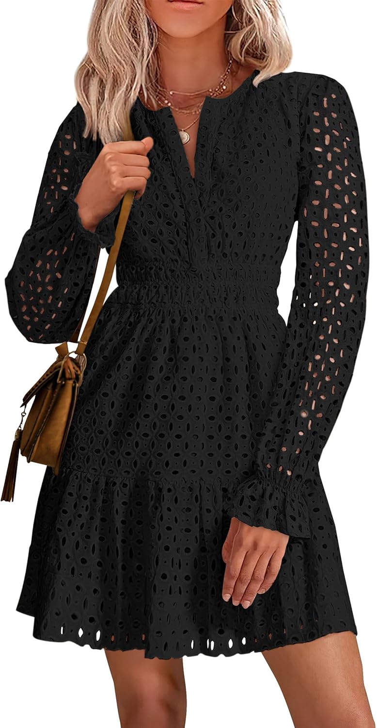 PRETTYGARDEN Long Sleeve Mini Dress for Women Hollow Out V Neck Fall Dresses