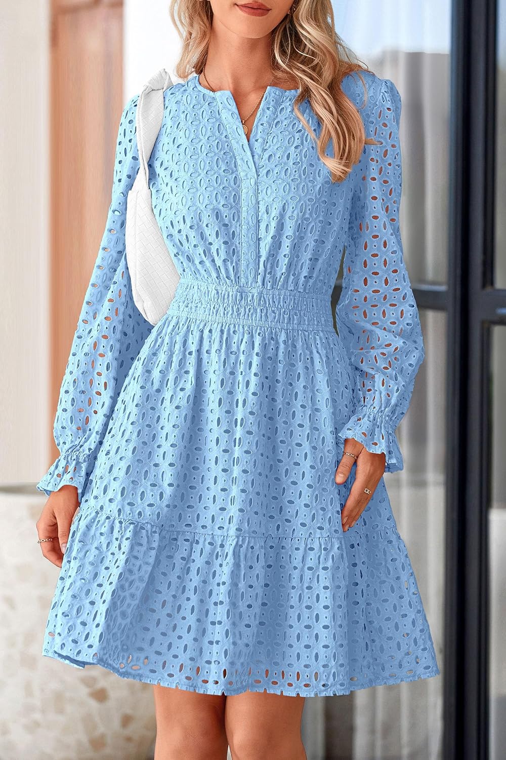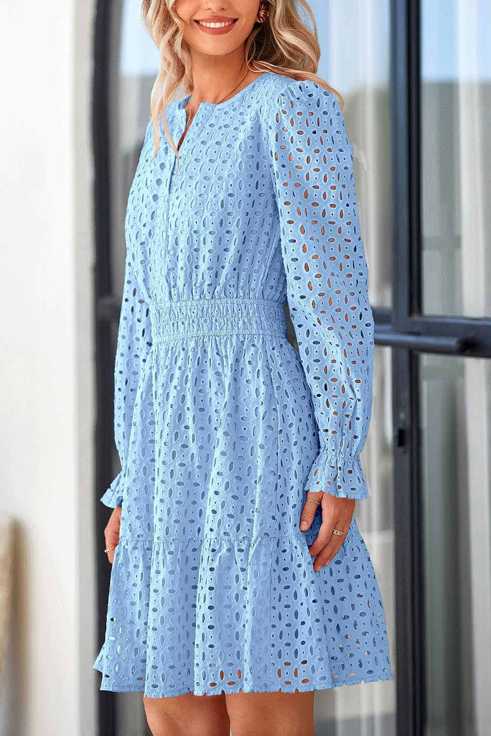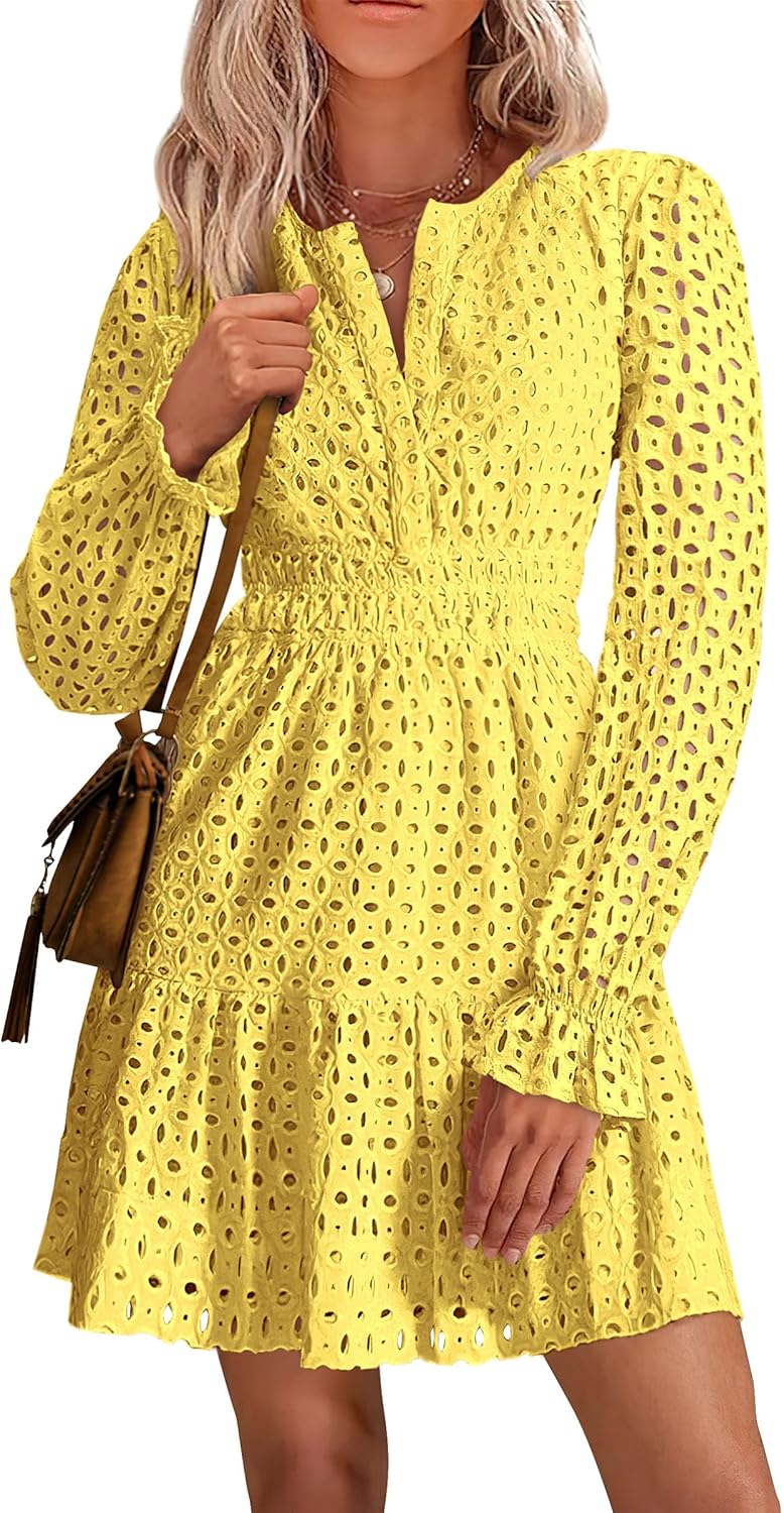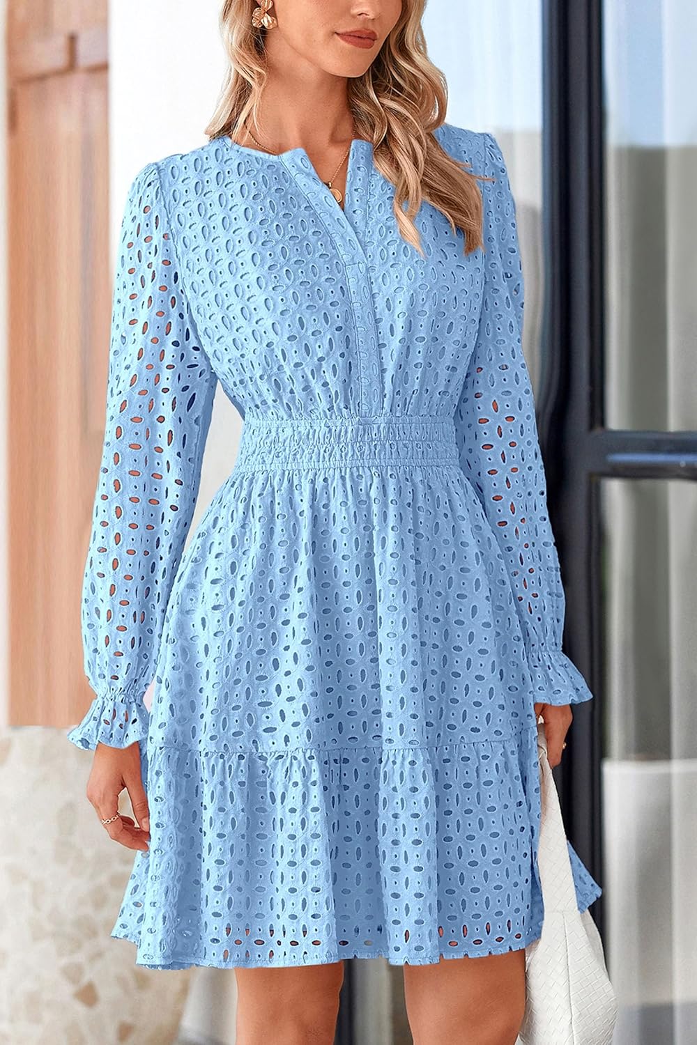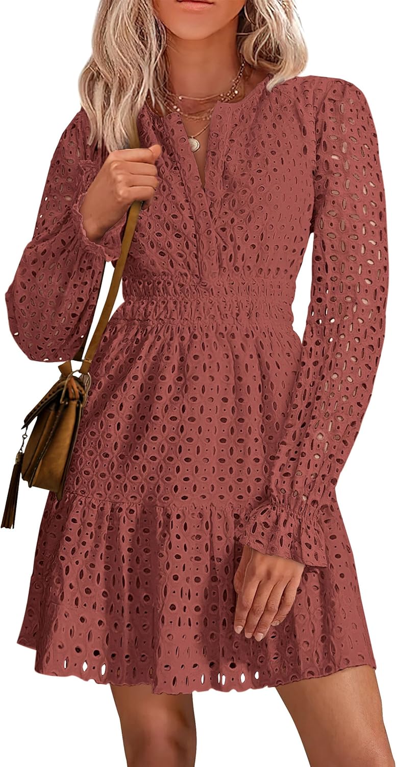 PRETTYGARDEN Long Sleeve Mini Dress for Women Hollow Out V Neck Fall Dresses