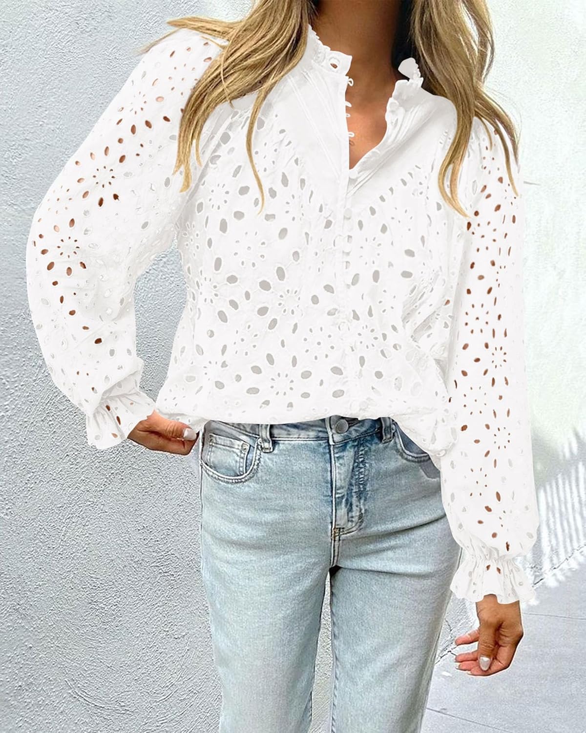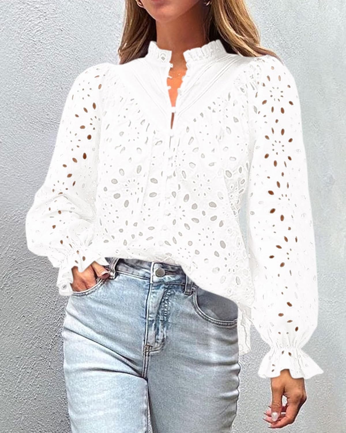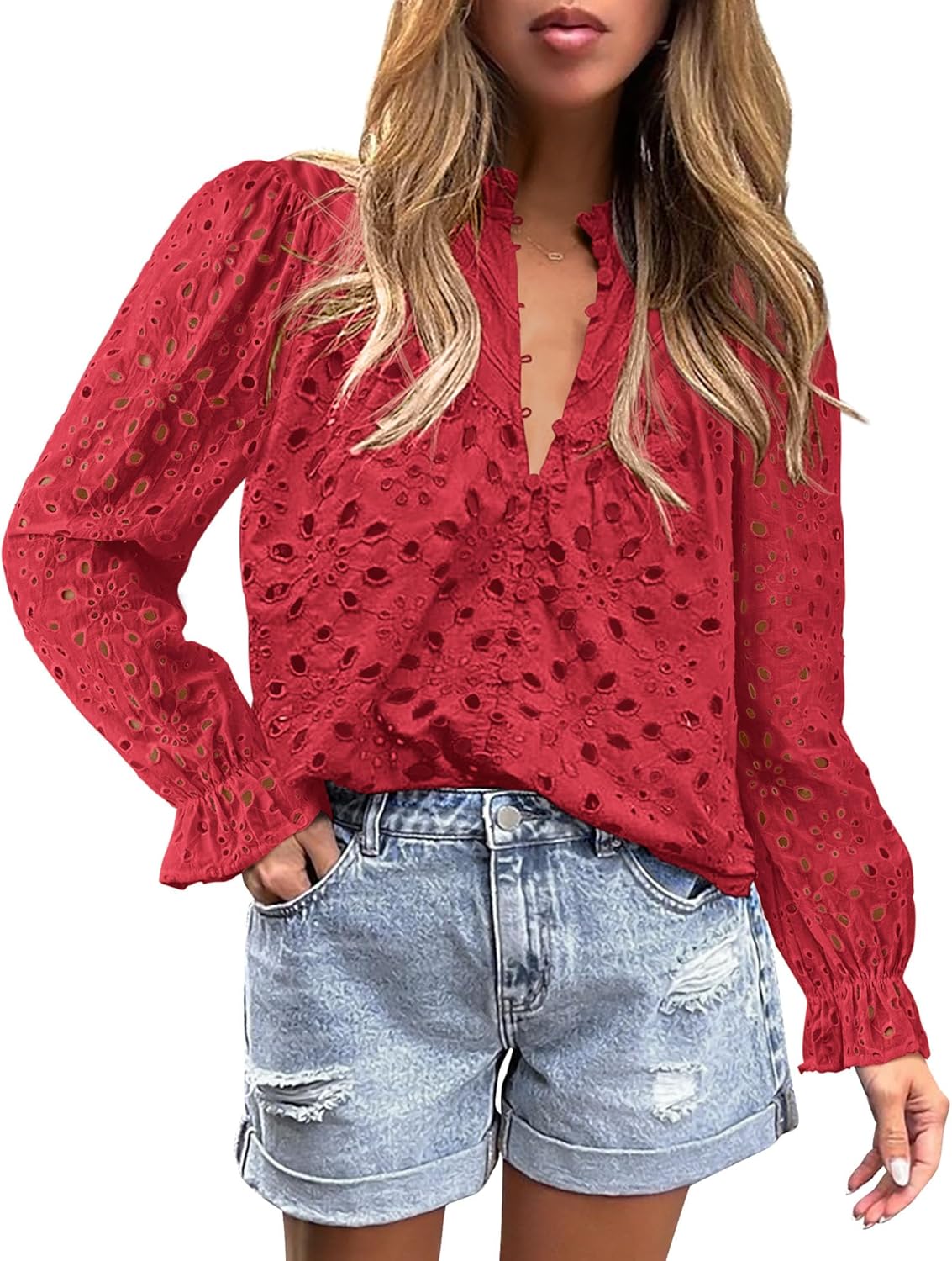PRETTYGARDEN Long Sleeve Tops for Women V Neck Hollow Out Blouse Shirts