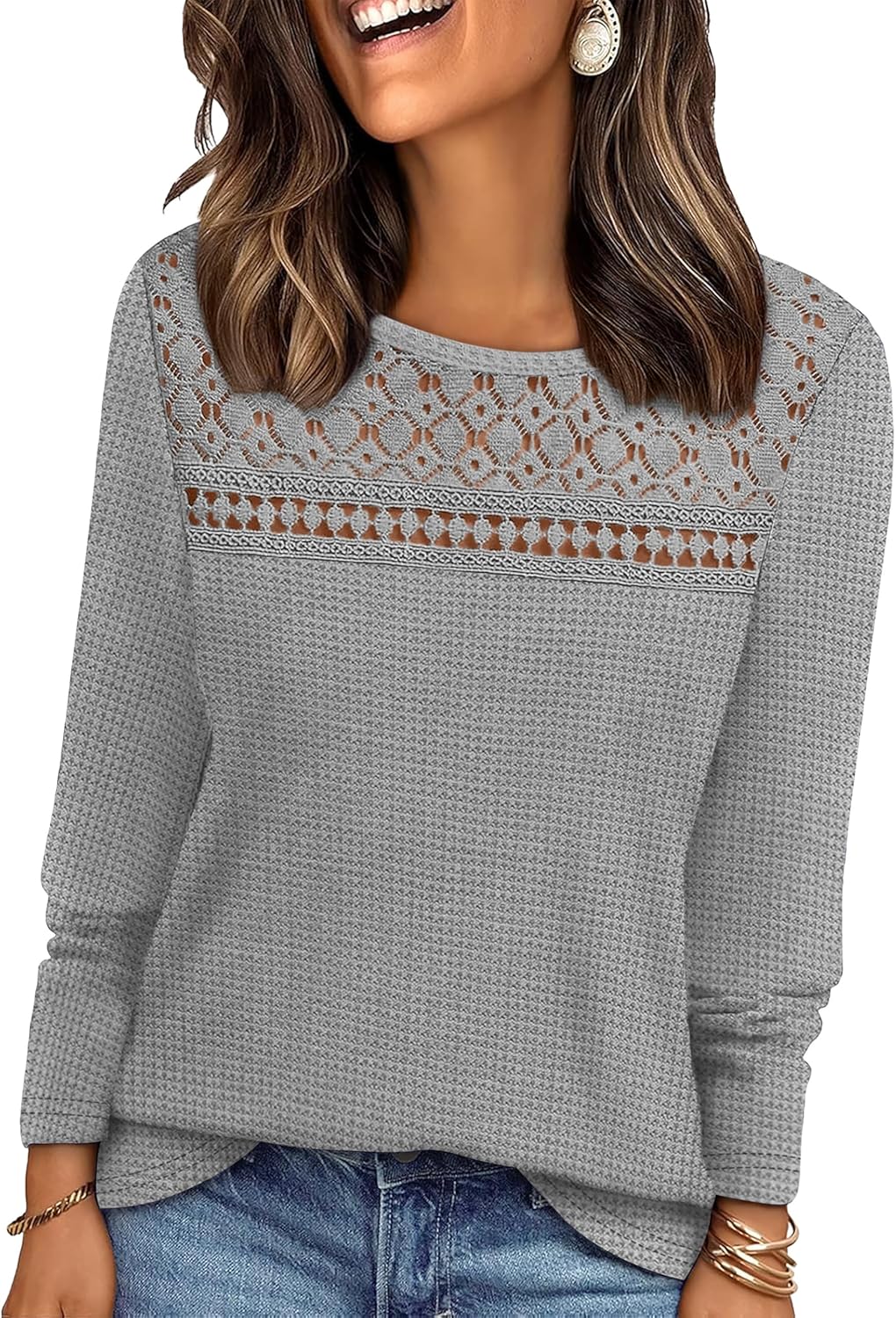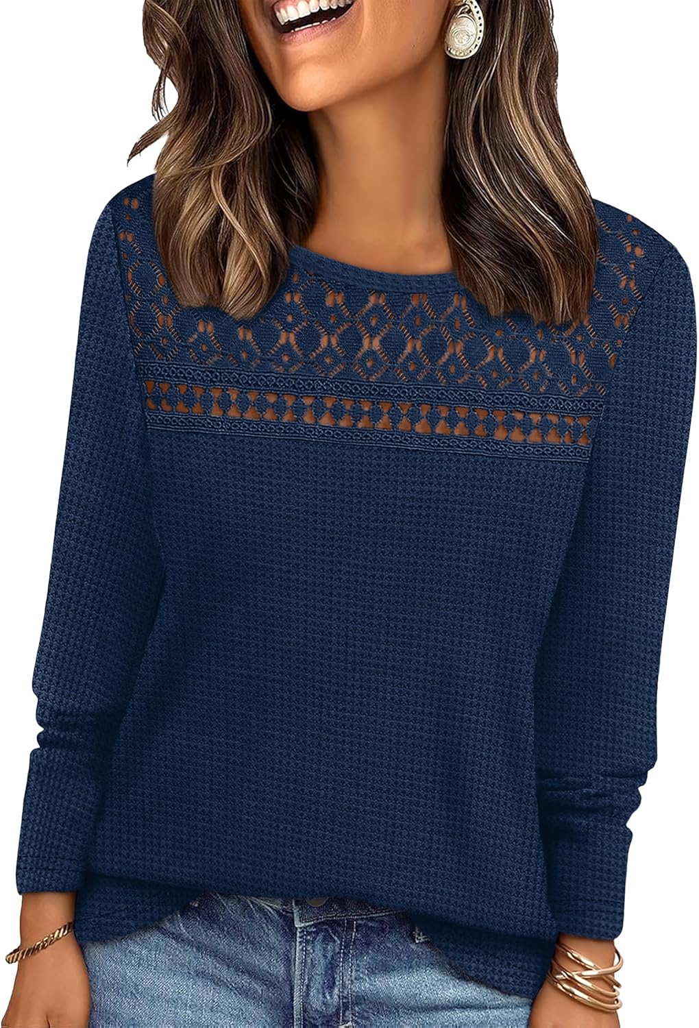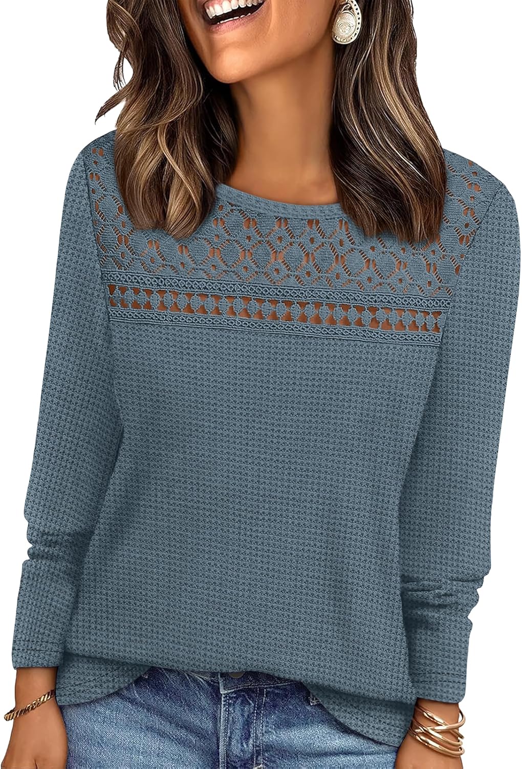 WIHOLL Women Blouses Long Sleeve Shirts Fall Fashion 2025 Lace Waffle Knit Tops